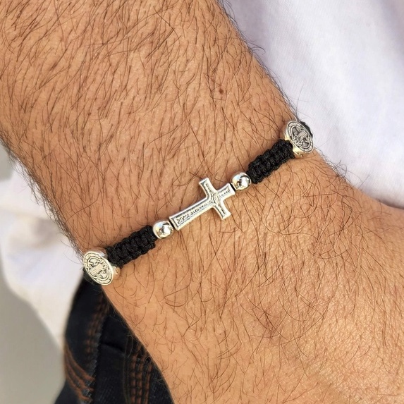 Pulseira com medalha de São bento e Cruz em metal. Material de cordão encerado ajustável. Pulseira linda ideal para presente.