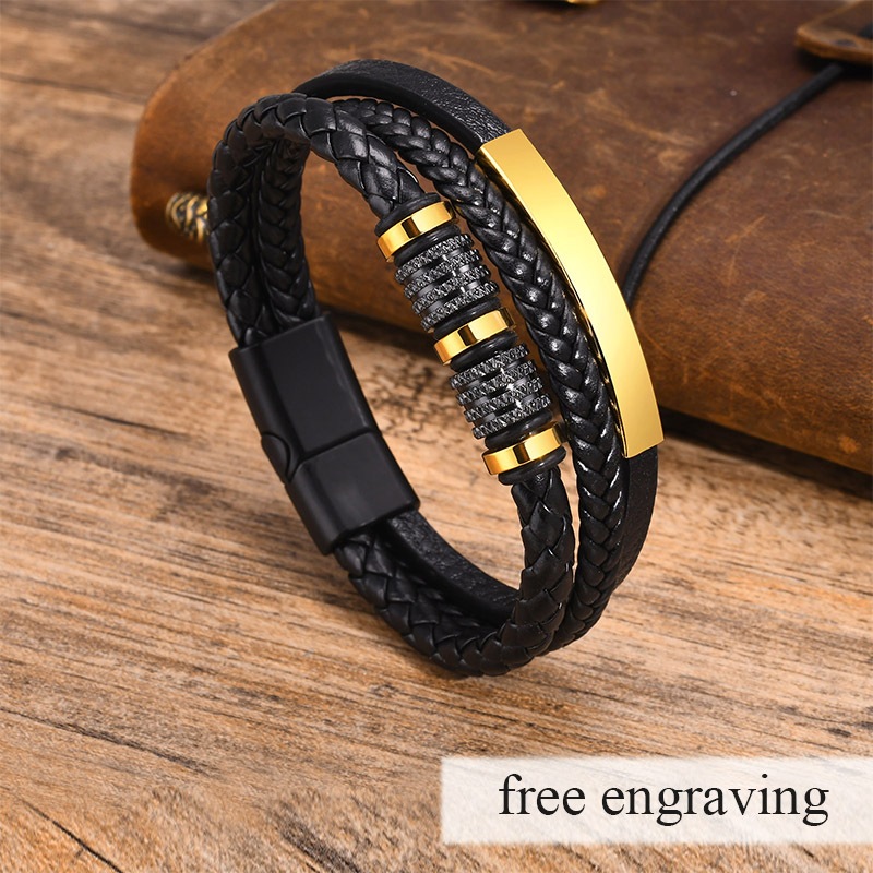 Pulseira Masculina Vnox De Aço Inoxidável Com Curvatura De Luz Completa Preta Nome De Gravação Grátis De Couro PU De Trê