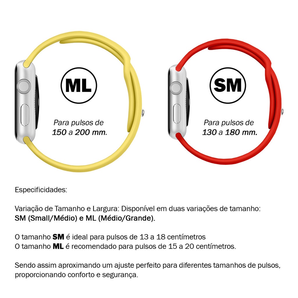 ATENÇÃO: PARA APPLE WATCH 42MM DA SÉRIE 10, RECOMENDAMOS SELECIONAR A VARIAÇÃO 38/40/41MM PARA O ENCAIXE PERFEITO. Pulseira Para Apple Watch Compatível Com Todas as Séries Principais Características do Produto: O Apple Watch já tem cerca de dez modelos (1, 2, 3, 4, 5, 6, 7, 8, SE e Ultra), embora as duas primeiras gerações não sejam mais fabricadas nem comercializadas. O mesmo vale para o AppleWatch 4, por exemplo, que não é mais encontrado facilmente nos sites de venda. Contudo, nossas Pulseira Sport Lisa para AppleWatch servirá para qualquer modelo que venha possuir. Contado com um catálogo extremamente amplo de cores e também tamanhos disponíveis. Sendo assim você chegou no lugar certo para adquirir sua pulseira para AppleWatch. Com a íncrivel tecnologia de fechos magnéticos ----------------------------------------------------------------------------------------------------------------------------------------------------------------------------------------------------------------------- Material: Silicone Premium ----------------------------------------------------------------------------------------------------------------------------------------------------------------------------------------------------------------------- Modelo do Fecho: Fivela em formato pingente; Metal (Pinagem Fivela) ----------------------------------------------------------------------------------------------------------------------------------------------------------------------------------------------------------------------- Modelos de smartwatches compatíveis: - Todas as series de Compatível com AppleWatch (confira o tamanho na variação conforme o tamanho da caixa do relógio) - Compatível com AppleWatch Ultra 2 - Compatível com AppleWatch Series 9 - Compatível com AppleWatch Ultra - Compatível com AppleWatch Series 8 - Compatível com AppleWatch SE (2ª geração) - Compatível com AppleWatch Series 7 - Compatível com AppleWatch Series 6 - Compatível com AppleWatch SE - Compatível com AppleWatch Series 5 - Compatível com AppleWatch Series 4 - Compatível com AppleWatch Series 3 - Compatível com AppleWatch Series 2 - Compatível com AppleWatch Series 1 - Compatível com AppleWatch (1ª geração) Entre outros que usam o padrão de encaixe pulseiras da Apple: - Smartwatch W26, W27, W28, W29, W46, W57, W58, W59, W68, W69 - Smartwatch X7, F8, F9, G500, AK76 - Smartwatch T500 ,T600, T700, T800, T900 - Smartwatch W34, W34s, K8, K9, X6, X7, X8 - Smartwatch HW12, HW16, HW22 - Smartwatch DT6, DT7, DT8, DT900, DT Ultra Em caso de dúvidas nos chame no chat/perguntas. ----------------------------------------------------------------------------------------------------------------------------------------------------------------------------------------------------------------------- Tamanho de caixas compatíveis: - 38mm/ 40mm/ 41mm - 42mm/ 44mm/ 45mm/ 46mm/ 49mm ATENÇÃO: PARA APPLE WATCH 42MM DA SÉRIE 10, RECOMENDAMOS SELECIONAR A VARIAÇÃO 38/40/41MM PARA O ENCAIXE PERFEITO. Tamanhos: SM (Pequeno/ Médio) ideal para pulsos de 13 a 18 CM ML (Médio/ Grande) ideal para pulsos de 15 a 20 CM ----------------------------------------------------------------------------------------------------------------------------------------------------------------------------------------------------------------------- Tamanho da Pulseira: Único, Padrão Regulável ----------------------------------------------------------------------------------------------------------------------------------------------------------------------------------------------------------------------- Modelo de referência do Produto: Pulseira Coloridas Compatível com AppleWatch ----------------------------------------------------------------------------------------------------------------------------------------------------------------------------------------------------------------------- Dimensões da Embalagem: - Altura: 02cm - Largura: 16cm - Comprimento: 21cm - Peso: 105g ----------------------------------------------------------------------------------------------------------------------------------------------------------------------------------------------------------------------- Das Garantia do Produto e compra: Garantia do Produto: - Contra defeitos de fabricação ----------------------------------------------------------------------------------------------------------------------------------------------------------------------------------------------------------------------- Fique Atento! A percepção das cores nas fotos dos produtos podem variar conforme a configuração do seu monitor ou da tela do seu celular. Todas as marcas comerciais a seguir são propriedade dos respectivos proprietários. Apenas revendemos os produtos neste site anunciados* Descrição sobre