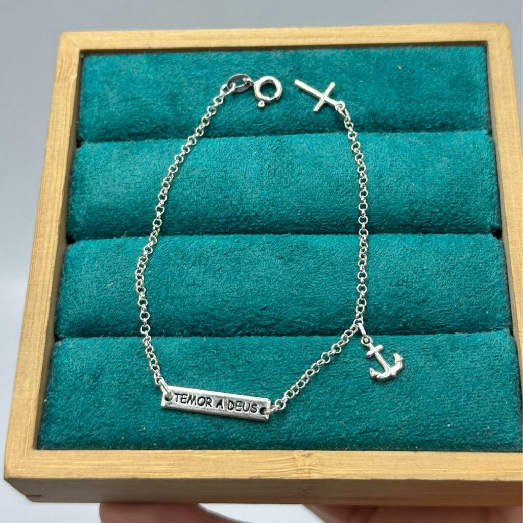 Pulseira placa temor a Deus cruz e âncora prata 925