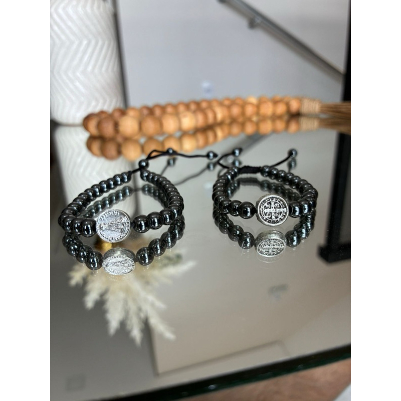 Pulseira São Bento e Nossa Senhora Aparecida – Hematita Ajustável | Envio Rápido e Compra Segura
