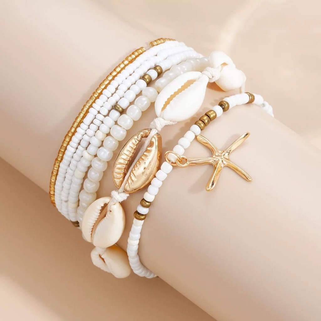 Pulseiras trançadas com contas de arroz e conchas de estrela do mar com 7 peças para férias na praia