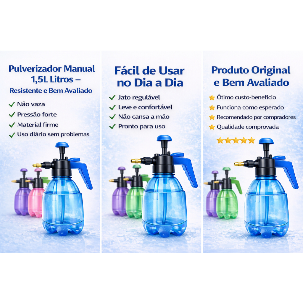 🌿 Pulverizador Manual 1,5 Litros – Original, Resistente e Muito Bem Avaliado O Pulverizador Manual 1,5L é um dos modelos mais procurados e elogiados por quem busca praticidade, resistência e eficiência no dia a dia. Produzido com material firme e durável, ele entrega pressão forte e constante, sem vazamentos, sendo ideal para uso doméstico, jardinagem e limpeza em geral. ⭐ O QUE OS COMPRADORES MAIS ELOGIAM ✔️ Produto original e resistente ✔️ Pressão forte e constante ✔️ Não vaza ✔️ Fácil de usar, não cansa a mão ✔️ Excelente custo-benefício 💦 PRINCIPAIS CARACTERÍSTICAS Capacidade: 1,5 litros Tipo: Pulverizador manual de pressão Jato regulável (névoa ou jato direto) Bico metálico ajustável Sistema de bombeamento eficiente Pegada confortável e fácil acionamento Vedação segura, evita vazamentos Produto leve e prático 🏡 INDICAÇÕES DE USO ✔️ Jardinagem e plantas ✔️ Horta e quintal ✔️ Limpeza doméstica ✔️ Umidificação de ambientes ✔️ Uso geral em casa, sítio ou área rural 🎨 CORES DISPONÍVEIS 🔵 Azul 🟢 Verde 🟣 Roxo 🌸 Rosa 📦 INFORMAÇÕES ADICIONAIS Produto original Pronto para uso Uso doméstico e rural Fácil manutenção ✅ POR QUE COMPRAR ESTE PULVERIZADOR? Porque é um produto simples, eficiente e bem avaliado, que realmente entrega o que promete. Ideal para quem quer durabilidade, facilidade de uso e versatilidade, sem complicação.