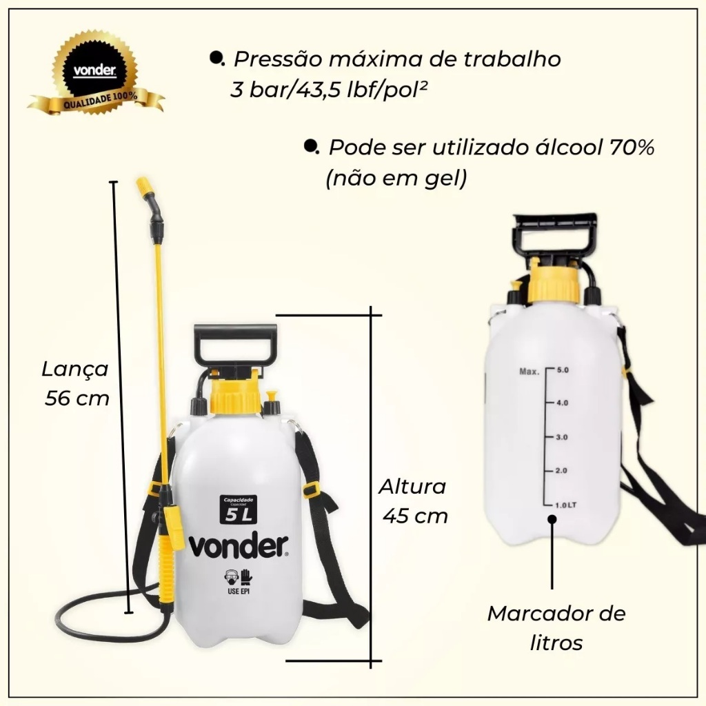 O Pulverizador Vonder PL005 é equipado com haste para pressurização, bico com jato ajustável e válvula de alívio de pressão interna. É indicado para pulverização em geral, mas não deve ser usado com produtos químicos como solventes, ácidos ou tintas. A pressão máxima de trabalho é de 3 bar / 43,5 lbf/pol². Este equipamento é destinado à aplicação de produtos líquidos em diversas superfícies, sendo ideal para produtos de limpeza, fertilizantes e defensivos agrícolas. Com capacidade de 5 litros, o pulverizador é feito de plástico resistente, o que proporciona durabilidade e facilidade na limpeza. Possui alça ergonômica para facilitar o transporte e o uso. A ponta ajustável permite o controle da vazão de líquido conforme a necessidade, e a bomba de alta pressão ajuda na aplicação do produto, alcançando ampla área de superfície com uma única carga. O sistema de alívio de pressão assegura a segurança durante o uso, prevenindo acidentes. CARACTERÍSTICAS: - Capacidade de 5 litros; - Haste para pressurização; - Bico com jato ajustável; - Válvula de alívio de pressão interna; - Indicado para pulverização em geral; - Feito de plástico resistente; - Bomba de alta pressão; - Ponta ajustável para controle de vazão; - Utilizável em diversas superfícies; - Prático e eficaz para uso variado. ESPECIFICAÇÕES TÉCNICAS: - Marca: Vonder - Modelo: PL005 - Capacidade: 5 litros - Material do reservatório: Plástico resistente - Tipo: Agrícola - Sistema de acionamento: Tipo bomba - Sistema de compressão: Compressão prévia - Dimensões aproximadas do produto (A x L x C): 40 x 18 x 18 cm - Peso: 1,25 kg CONTEÚDO DA EMBALAGEM: - 01 Pulverizador Vonder PL005 - Haste para pressurização - Bico com jato ajustável - Válvula de alívio de pressão interna - Manual de instruções