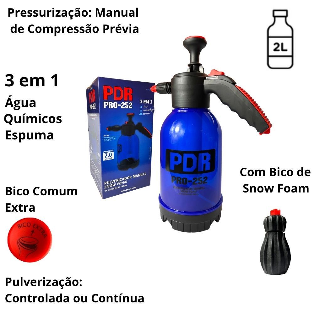 Você está comprando: 01 Pulverizador Snow Foam Pdr 01 Tubo de Sucção extra 01 Bico de Pulverização Comum Extra 01 Bico de Jato de Espuma (Snow Foam) 01 Caixa de Papelão Transforme sua rotina de cuidados automotivos com o Pulverizador Snow Foam PDR Pro 252! Ideal para quem busca praticidade, eficiência e acabamento impecável, ele garante uma lavagem com espuma densa e uniforme, potencializando a limpeza e protegendo a pintura do seu veículo. Versátil e robusto, é perfeito para limpeza com espuma, enxágue com bico comum, aplicação de insulfilm, PPF, e muito mais. Além disso, pode ser utilizado em jardinagem, para umedecer plantas e pulverizar inseticidas, herbicidas, fungicidas e soluções naturais — tudo com máximo controle e segurança. Com capacidade para 2 litros e sistema de pressurização manual de compressão prévia, ele oferece pulverização suave, contínua e com regulagem precisa. Conta ainda com gatilho com trava, válvula de segurança, bico regulável e acompanha bico extra + bico snow foam, garantindo mais versatilidade no dia a dia. Ideal para lavagem automotiva com efeito Snow Foam Funções: água, químicos e espuma Pulverização contínua ou controlada Construção resistente com excelente ergonomia Pronto para uso em diferentes aplicações Não utilizar com solventes, ácidos ou tintas. Informações técnicas Capacidade: 2 Litros Pressurização: Manual, de Compressão Prévia Funções: 3 em 1 (Água, Químicos e Espuma) Bico: Regulável Pulverização: Controlada ou Contínua Acionamento: Gatilho com trava para pulverização continua Válvula de Segurança: Para alívio de pressão interna Acompanha: 1 bico extra, 1 bico snow foam e 1 tubo de sucção extra Peso Apróx: 480g Dimensões Apróx CxLxA: 17x17x34cm Garantia de 06 meses concedido pelo Fabricante Sku da Loja 10875