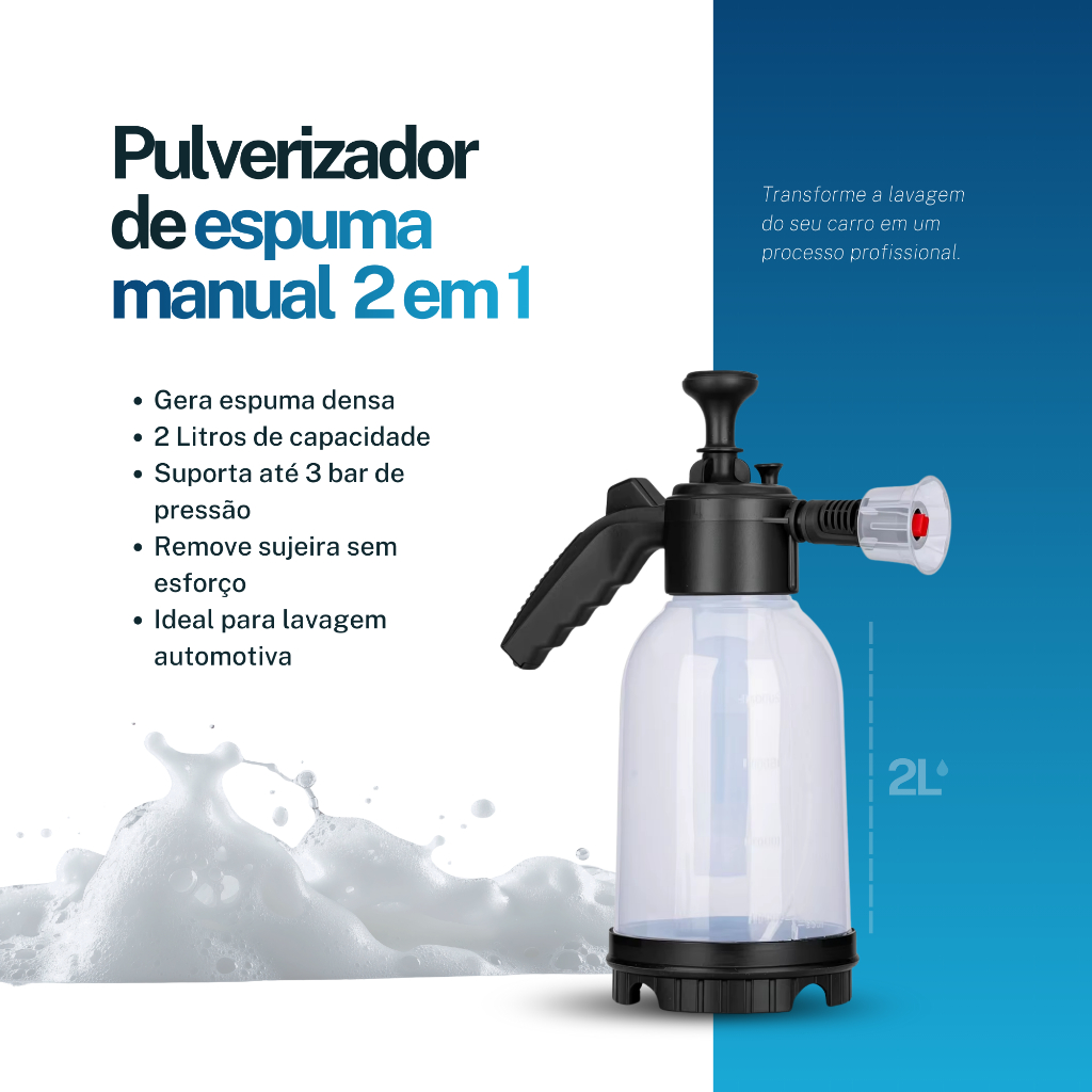 Pulverizador Snow Foam 2 Litros Max Lotus – Espuma Profissional em Casa Chega de lavagens comuns que não removem a sujeira de verdade. Com o Pulverizador Snow Foam 2L Max Lotus, você cria espuma densa e uniforme, igual às lavagens profissionais, protegendo a pintura e economizando produto. -2 em 1: funciona como gerador de espuma (snow foam) ou pulverizador comum, se adaptando a qualquer tipo de limpeza. -Capacidade ideal de 2 litros: cobre grandes áreas sem precisar reabastecer o tempo todo. -Espuma mais eficiente: a espuma gruda na superfície, solta a sujeira e reduz o risco de riscos na pintura. Por que escolher o Max Lotus? ✔ Não precisa de lavadora de alta pressão – uso 100% manual ✔ Compatível com shampoos, detergentes e desengraxantes ✔ Economiza produto, pois distribui melhor o líquido ✔ Uso fácil e confortável, com design ergonômico ✔ Alta resistência, fabricado em plástico PE reforçado Uso versátil: Ideal para: -Carros -Motos -Barcos -Limpezas domésticas em geral Perguntas frequentes: “Será que a espuma fica fraca?” Não. O sistema foi projetado para gerar espuma densa, uniforme e consistente, desde que a diluição seja feita corretamente. Além disso, para alcançar aquela espuma encorpada e visualmente bonita, é fundamental utilizar produtos adequados, como shampoos automotivos próprios para snow foam, que possuem formulação específica para alta espumação. Produtos comuns ou inadequados podem comprometer o resultado, mesmo com um bom equipamento. “É frágil?” Não. Suporta pressão de até 3 bar e uso frequente. “É difícil de usar?” Não. Encha, bombeie e aplique. Simples e rápido. Transforme sua lavagem em um nível profissional, gastando menos e cuidando melhor do seu veículo. Garanta agora o Pulverizador Snow Foam 2L Max Lotus!