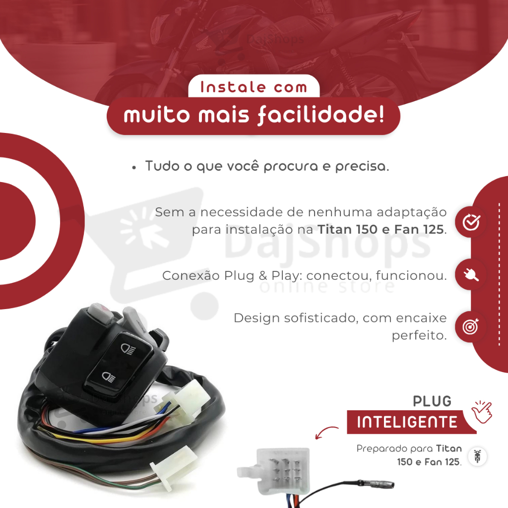 Punho Luz Titan 150 Titan 160 Fan 125 150 Start Modelo Cb 650 Nc750 *** ENVIO IMEDIATO!!!*** ***COM NOTA FISCAL*** O punho chave de seta é um componente essencial para sua motocicleta. Ele é projetado para controlar uma variedade de funções elétricas, como os indicadores de direção, luzes de emergência, Buzina e farol alto e baixo. O punho chave de luz NC 750/700 adaptável na Titan 160 Fan Start é um acessório que permite substituir a chave de luz original da sua moto por uma chave de luz de modelo NC 750/700. Essa chave de luz NC 750/700 possui um design mais moderno e ergonômico, além de contar com funções adicionais, como pisca alerta e lampejador. ----------------------------------------------------------------------------------------------------------- Compatível Com: Honda Fan 125 Honda Fan 150 Honda Titan 150 ** Para esses modelo acima, não tem necessidade de adaptação ** ----------------------------------------------------------------------------------------------------------- Compatível Com: Honda NC 750/700 Honda Titan 160 Fan 2016 a 2022. Honda Titan 160 Start 2016 a 2022. Honda Fan 160 2016 em diante. ----------------------------------------------------------------------------------------------------------- A instalação do punho chave de luz NC 750/700 adaptável Titan 160 Fan Start é recomendada por um profissional qualificado. ----------------------------------------------------------------------------------------------------------- O punho possui as seguintes funções: Pisca alerta: aciona as setas da moto de forma simultânea. Lampejador: aciona as setas da moto de forma intermitente, para indicar uma mudança de direção. Farol alto e baixo: aciona o farol da moto, podendo ser ajustado para alta ou baixa luminosidade. Setas: aciona as setas da moto de forma individual. Buzina: aciona a buzina da moto.