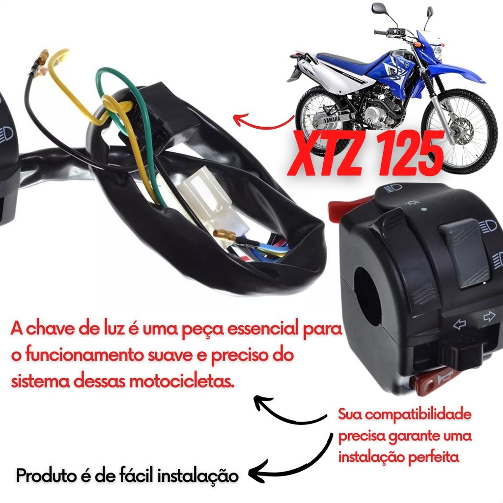 Chave de luz do lado esquerdo, contendo o botão do farol liga/desliga, setas e buzina. Conta com proteção em todos os fios, auxiliando na proteção contra danos causados pela chuva e calor, proporcionando maior vida útil ao produto. Compatível com: - Yamaha Xtz 125 K: 2003 até 2014; - Yamaha Xtz 125 E: 2003 até 2016; - Yamaha Xtz 125 XK: 2008 até 2013; - Yamha Xtz 125 Xe: 2008 até 2016; - Yamaha Ybr 125 Factor K E Ed: 2000 até 2008; - Yamaha Ybr 125 Factor K E Ed: 2009 até 2013. Observação: Não tem certeza de qual versão é a sua moto? Veja abaixo as diferentes versões para esclarecer suas dúvidas: - KS / K: Partida a pedal; - KSE: Partida a pedal + partida elétrica; - ES / E: Partida elétrica; - ESD / ED: Partida elétrica + freio a disco; - ESDD: Partida elétrica + freios a disco em ambas as rodas, dianteira e traseira; - ESDI: Partida elétrica + freio a disco + injeção eletrônica; - Mix/Flex: Combustível gasolina e etanol. Detalhes: - Fios: 12 Fios; - Este produto pos sui fácil instalação, não exige que mude a estrutura de sua moto, pois foi confeccionado seguindo as especificações do produto original, para encaixe e funcionamento perfeito; - Produto elaborado com material de alta qualidade, testado e aprovado dentro das normas de segurança. Garantia: - Este produto possui 3 meses de garantia contra defeitos de fabricação. Itens inclusos: - 01 chave de luz (lado esquerdo).