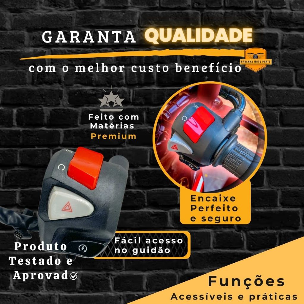 Punho de Partida Com Pisca Alerta (Modelo Cb 500) Magnetron O interruptor tem a função de informar o acionamento da buzina, embreagem, farol, freios, cavaletes, neutro, partida e pisca. Compatível com: HONDA CG 150 CARGO CES 2013 CG 150 CARGO CES 2014 CG 150 CARGO CES 2015 CG 150 TITAN EX 2014 CG 150 TITAN EX 2015 CG 160 TITAN 2016 CG 160 TITAN 2017 CG 160 TITAN 2018 CG 160 TITAN 2019 CG 160 TITAN 2020 CG 160 TITAN 2021 CG 160 TITAN 2022 CG 160 TITAN 2023 CG 160 FAN 2016 CG 160 FAN 2017 CG 160 FAN CBS 2018 CG 160 FAN CBS 2019 CG 160 FAN CBS 2020 CG 160 FAN CBS 2021 CG 160 FAN CBS 2022 CG 160 FAN CBS 2023 CG 160 CARGO 2016 CG 160 CARGO 2017 CG 160 CARGO CBS 2018 CG 160 CARGO CBS 2019 CG 160 CARGO CBS 2020 CG 160 CARGO CBS 2021 CG 160 CARGO CBS 2022 CG 150 FAN ESDi 2014 CG 150 FAN ESDi 2015 CG 150 TITAN ESD 2014 CG 150 TITAN ESD 2015 Conteúdo da Embalagem: 01 Interruptor de Partida e Emergência com Pisca Alerta- Magnetron Código Original (OEM) Honda: 35150-KVS-F01 Características: - Função Pisca Alerta - Função de Partida - Função Corta Corrente - Excelente Acabamento. - Fácil Instalação na Moto. - Plug and Play, já acompanha os encaixes para instalação. - Material : Plástico ABS de alta resistência - Voltagem de operação : 12V - Tipo de montagem : No guidão (lado direito) - Conectores : Terminais originais (conectores padrão de fábrica) Sua moto não está ligando porque o botão de partida parou de funcionar? Adquira Interruptor de partida e emergência feito no padrão original. Punho de partida, pronto para instalação, contendo o botão de partida e botão engine stop. Conta com proteção em todos os fios, auxiliando na proteção contra danos causados pela chuva e calor, proporcionando maior vida útil ao produto. Fabricado a partir do modelo original produzido com materiais de alta de qualidade e resistentes, garantindo maior durabilidade. Especificações Técnicas: - Padrão de Medidas OEM - Equivalente a Peça Original - Ideal para Reposição - Alta Resistência e Durabilidade - Confeccionado com a melhor matéria-prima - Material leve e resistente - Excelente qualidade e acabamento *Com esse botão de partida você garante longa vida útil sem perder as funções dos seus devidos acionamentos. Aproveite! Importante: - Para a instalação do produto corretamente, leve ao mecânico de sua confiança! - Não nos responsabilizamos pelo mau uso do produto.