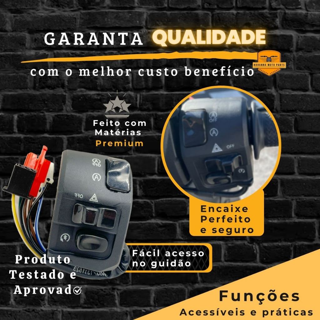 O interruptor tem a função de informar o acionamento da buzina, embreagem, farol, freios, cavaletes, neutro, partida e pisca. Conteúdo da Embalagem: 01 Punho de Partida e Emergência - Magnetron Código Original: B3F-H3973-00 B3F-H3973-01 Compatível com: YAMAHA NMAX 160 (2021-2023) NMAX 160 ABS SE (2023-2023) Sua moto não está ligando porque o botão de partida parou de funcionar? Adquira Interruptor de partida e emergência feito no padrão original. Punho de partida, pronto para instalação, contendo o botão de partida e botão engine stop. Conta com proteção em todos os fios, auxiliando na proteção contra danos causados pela chuva e calor, proporcionando maior vida útil ao produto. Fabricado a partir do modelo original produzido com materiais de alta de qualidade e resistentes, garantindo maior durabilidade. Especificações Técnicas: - Padrão de Medidas OEM - Equivalente a Peça Original - Ideal para Reposição - Alta Resistência e Durabilidade - Confeccionado com a melhor matéria-prima - Material leve e resistente - Excelente qualidade e acabamento *Com esse botão de partida você garante longa vida útil sem perder as funções dos seus devidos acionamentos. Aproveite! Características: - Produto desenvolvido com os mesmos parâmetros e encaixes do original, substituindo o mesmo sem nenhum problema ou adaptação. - Testado e aprovado dentro das normas de segurança. Importante: - Para a instalação do produto corretamente, leve ao mecânico de sua confiança! - Não nos responsabilizamos pelo mau uso do produto.