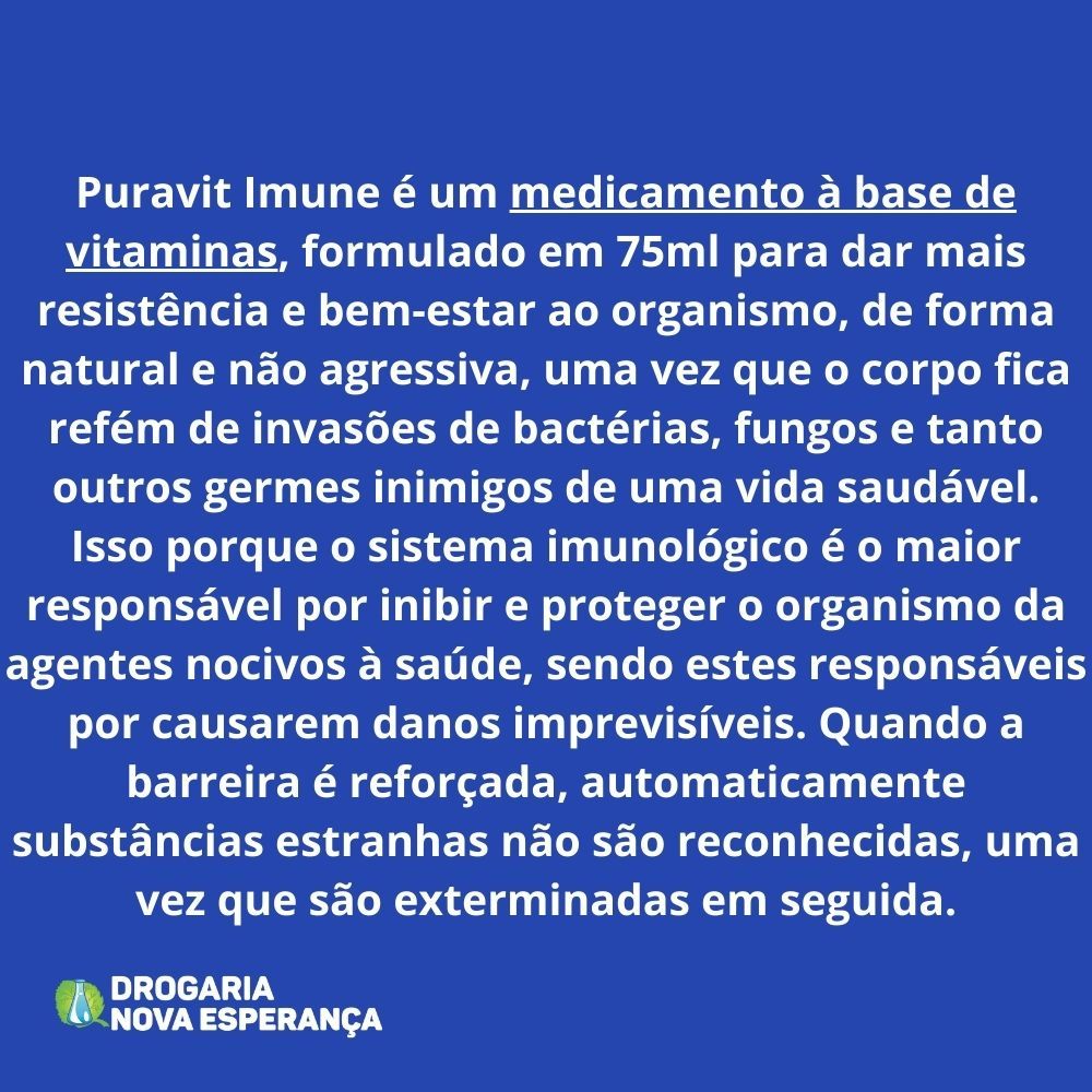 Puravit Imune é um medicamento utilizado para: Oferecer mais resistência e bem-estar ao organismo, de forma natural e não agressiva, uma vez que o corpo fica refém de invasões de bactérias, fungos e tanto outros germes inimigos de uma vida saudável.