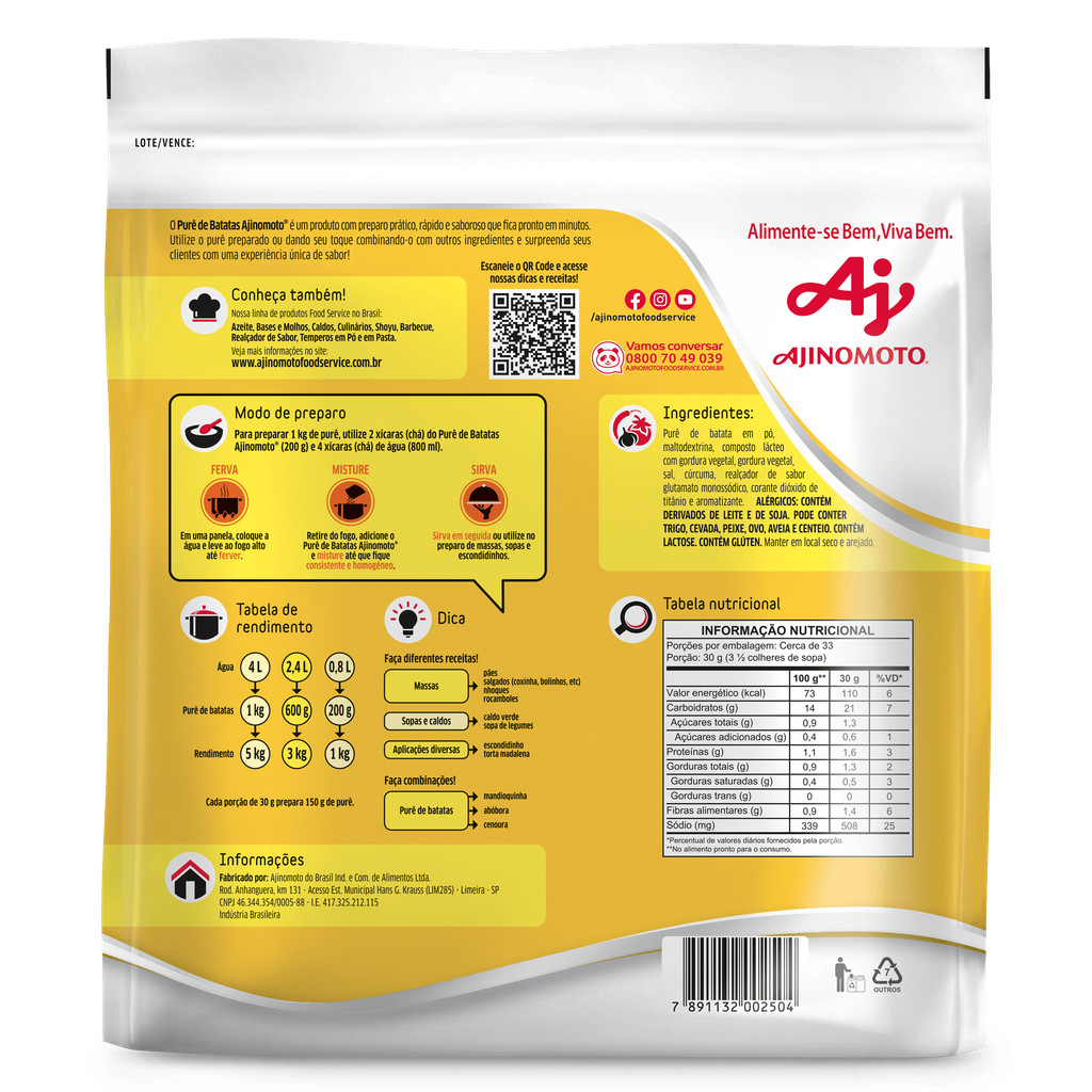 O Purê de Batatas Ajinomoto® é uma mistura em pó para preparo instantâneo de purê, ideal como acompanhamento ou base para receitas culinárias. Sua formulação oferece sabor caseiro, textura cremosa e preparo padronizado com excelente rendimento. É uma solução prática e segura para restaurantes, cozinhas industriais, hotéis e buffets que buscam agilidade, redução de perdas e padronização no serviço. Utilização: Preparo de 1 kg de purê: misturar 2 xícaras (chá) do produto (200 g) com 4 xícaras (chá) de água (800 ml). Rendimento: cada porção de 30 g de pó prepara cerca de 150 g de purê pronto. Aplicações: guarnições, recheios, bases para gratinados, receitas com carnes, entre outro. Condições de armazenamento: Embalagem fechada: manter em local seco, fresco e arejado, longe de fontes de calor.
