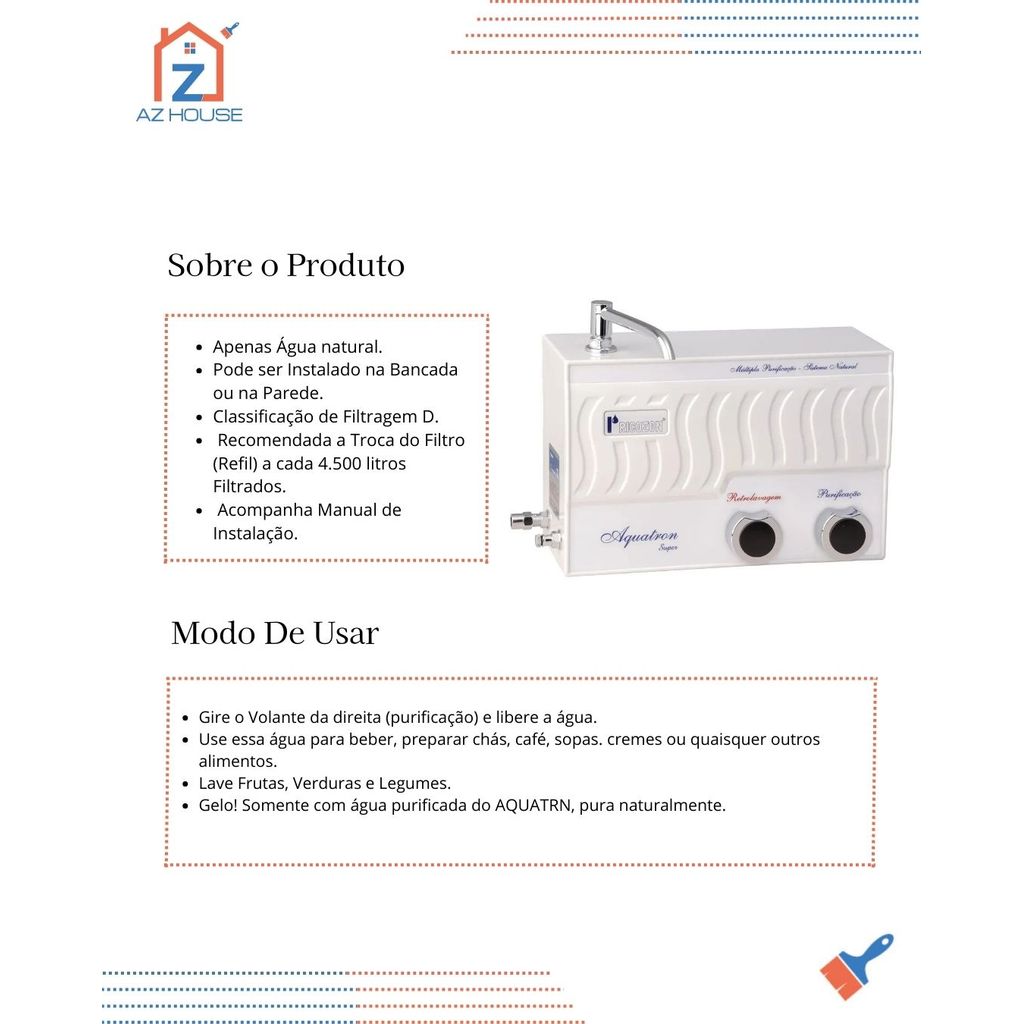 Purifique sua água com 7 etapas de filtragem, removendo impurezas e garantindo saúde e sabor. Com sistema de retrolavagem, instalação fácil e certificação NCC do Brasil. Ideal para sua casa ou escritório! Sistema de Filtragem: - Manta Filtrante - Retém partículas em suspensão na água como: ferro, barro, areia etc. - Dolomita/Quartzo - Através da dolomita/Quartzo são liberados na água cálcio e magnésio. - Carvão ativado - Contém uma vasta rede de micro e médios poros, com excelente dureza, o que o torna eficiente em filtros de água declorantes, removendo o cloro livre e outras impurezas dissolvidas na água. - Carvão ativado com prata coloidal - Contém uma vasta rede de micro e médios poros. Eficientemente impregnado com íons de prata, destrói as bactérias que forem absorvidas, além de eliminar o cloro livre, gosto e odores. - Fibra de polipropileno (sistema Melt-Blow) - para retenção de partículas. Características Técnicas: Redução cloro livre (*): com (Atende aos parâmetros da Norma NBR 16098:2012) Retenção de partículas (**): Classe ( D ) = 15 a < 30 m Controle nível microbiológico: Sim Vazão recomendada: 48 l/h Pressão mínima de trabalho: 25 kPa Pressão máxima de trabalho: 300 kPa Extraíveis: Atende aos parâmetros da norma NBR 16098:2012 Volume Interno do Aparelho: 250 ml Dimensões: Alt.: 20cm, Prof.: 12,5cm, Larg.: 30cm Temperatura de trabalho: Água Natural Conteúdo da embalagem: 1 Purificador AQUATRON 1 Manual de Instalação 1 Gabarito para perfuração 1 Assistência Técnica 1 Certificado de Garantia 1 Bucha, T para instalação 2 parafusos com bucha para fixação 1 mangueira para instalação. Como utilizar Local de instalacao : Ponto de uso (POU) Utilizar o aparelho em água distribuida pela rede local. (Conforme a legislacao vigente - Ministério da Saúde) Classificação deste produto Aparelho para melhoria da qualidade da água NBR16098:2012 Garantia de fábrica: 90 dias Dúvidas Frequentes: 1 - Os produtos são novos? R: Todos os produtos na Az House são produtos novos e com garantia. 2 - A mercadoria está disponível à pronta entrega? R: Todas as mercadorias são para pronta entrega. 3 - O produto acompanha nota fiscal? R: Toda a mercadoria é acompanhada de nota fiscal emitida para o CPF/CNPJ informado na compra. 4 - Como são realizadas as entregas? R: As entregas poderão ser realizadas via Correios ou Transportadoras. 5 - Os produtos possuem garantia? R: Todos os produtos possuem garantia mínima de 3 meses conforme o código do consumidor. Sobre a loja: Bem-vindo à Az House, sua loja virtual especializada em fornecer soluções para tornar sua casa um verdadeiro lar. Nosso compromisso é oferecer uma ampla variedade de produtos relacionados à reforma, variedades e tudo o que você precisa para transformar e aprimorar seu espaço residencial. Na Az House, valorizamos qualidade, praticidade e estilo, buscando sempre trazer para você os melhores produtos para suas necessidades domésticas. Desde ferramentas essenciais até acessórios decorativos, estamos aqui para ajudá-lo a criar o ambiente ideal para você e sua família desfrutarem. Explore nossa coleção e descubra como a Az House pode tornar seus projetos de casa ainda mais inspiradores e gratificantes :)