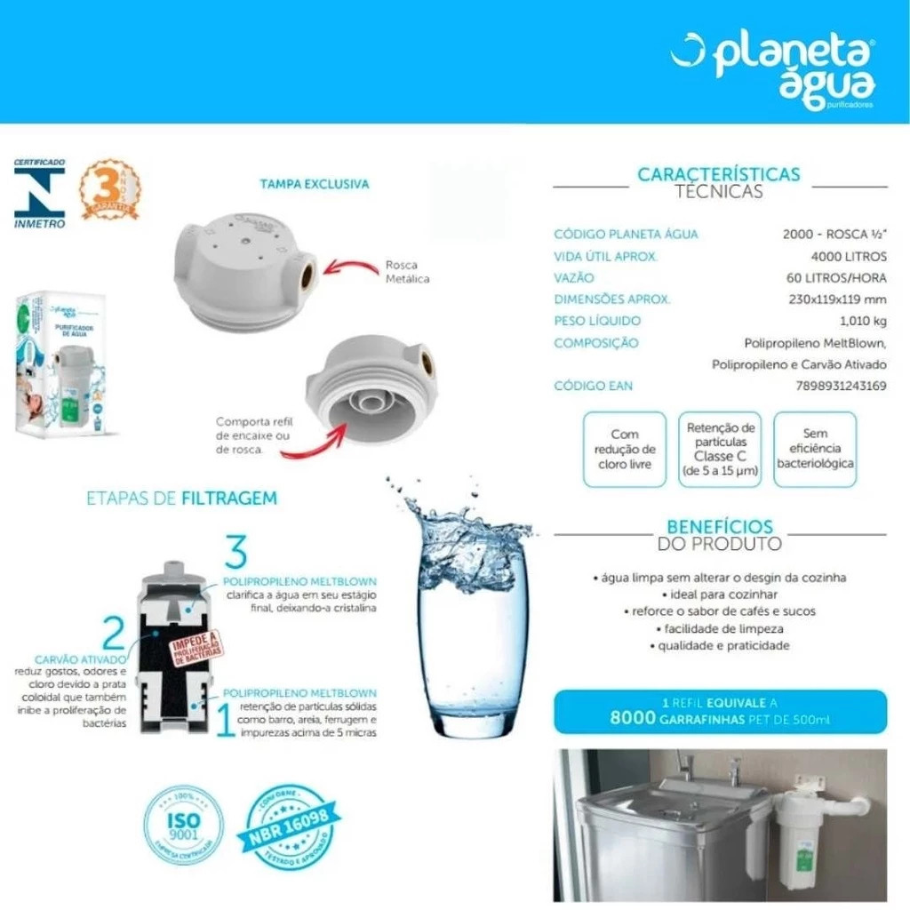 Purificador de Água FIT 200 Rosca Metal 1/2" com Refil PA 200 Carvão Ativado POU Planeta Água Bebedouro Torneira 2000