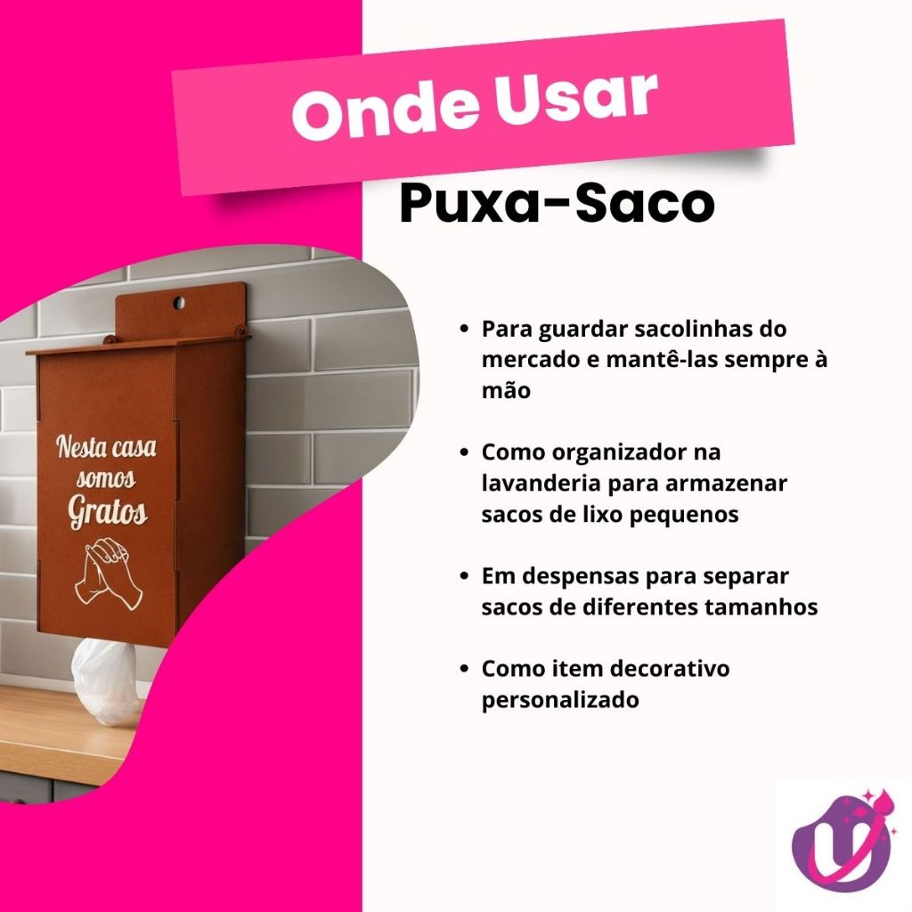 O Puxa-Saco em MDF é o aliado perfeito para manter sua cozinha organizada, bonita e sempre prática. Feito em MDF resistente, ele guarda e libera saquinhos plásticos de forma fácil, sem amassos e sem bagunça tudo isso enquanto adiciona um charme artesanal ao ambiente. Ideal para quem ama uma casa funcional sem abrir mão da estética. Material MDF 2,5mm Cores preto ou madeira. Tamanho: Altura: 30cm Comprimento: 10,5 Largura: 12 ECONOMIZE NO FRETE! Temos uma infinidade de produtos, acrescente mais produtos no seu carrinho! Tem alguma dúvida? Conte com nossa equipe para ajudá-lo!