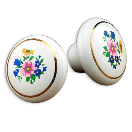 Puxador De Porcelana Cerâmica Redondo Estampado Floral Com Filete Dourado Gaveta Armário 32mm