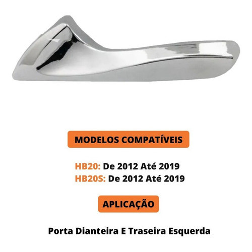 Olá, bem-vindo a Shoppeças! O melhor lugar para você comprar as peças e acessórios para o seu veículo. Somos uma empresa especializada em E-COMMERCE e disponibilizamos um portfólio de mais de 30 mil itens no setor Automotivo. Dentro dos segmentos de ferragens automotivas (fechaduras, maçanetas, cilindros, trincos de quebra vento), máquinas do vidro elétricas e manuais, tampas automotivas, borrachas de vedação, linha de suspensão e direção, amortecedores mola a gás, acessórios automotivos e palhetas. Possuímos o claro propósito de facilitar a vida das pessoas, ofertando produtos que permitirão segurança, conforto e que agregam valores a vida de cada um. TODA COMPRA APROVADA ATÉ ÀS 14H É ENVIADA NO MESMO DIA! Dúvidas? Fale com a gente pelo campo "Pergunte ao vendedor".- Peça original Universal Automotive, a melhor marca para peças de reposição do mercado! Maçaneta Interna produzida com materiais de Altíssima Qualidade e Durabilidade, seguindo exatamente o mesmo padrão de fabricação e características da peça original de fábrica. Dispense peças paralelas e 2ª linhas. Compre com garantia! A sua satisfação ou o seu dinheiro de volta!- CONTEÚDO DA EMBALAGEM 01 Maçaneta Interna (Gatilho) – Lado Esquerdo Cor Prata- APLICAÇÃO HB20 – 2012 a 2019HB20 S – 2012 a 2019- IDENTIFICAÇÃO DO PRODUTO Marca: Universal AutomotiveSKU Universal: 15683- COM GARANTIA DE 3 MESES- INSTALAÇÃO:Este é um produto técnico e deve ser aplicado por um profissional, assim se garante a longa vida útil dele.-