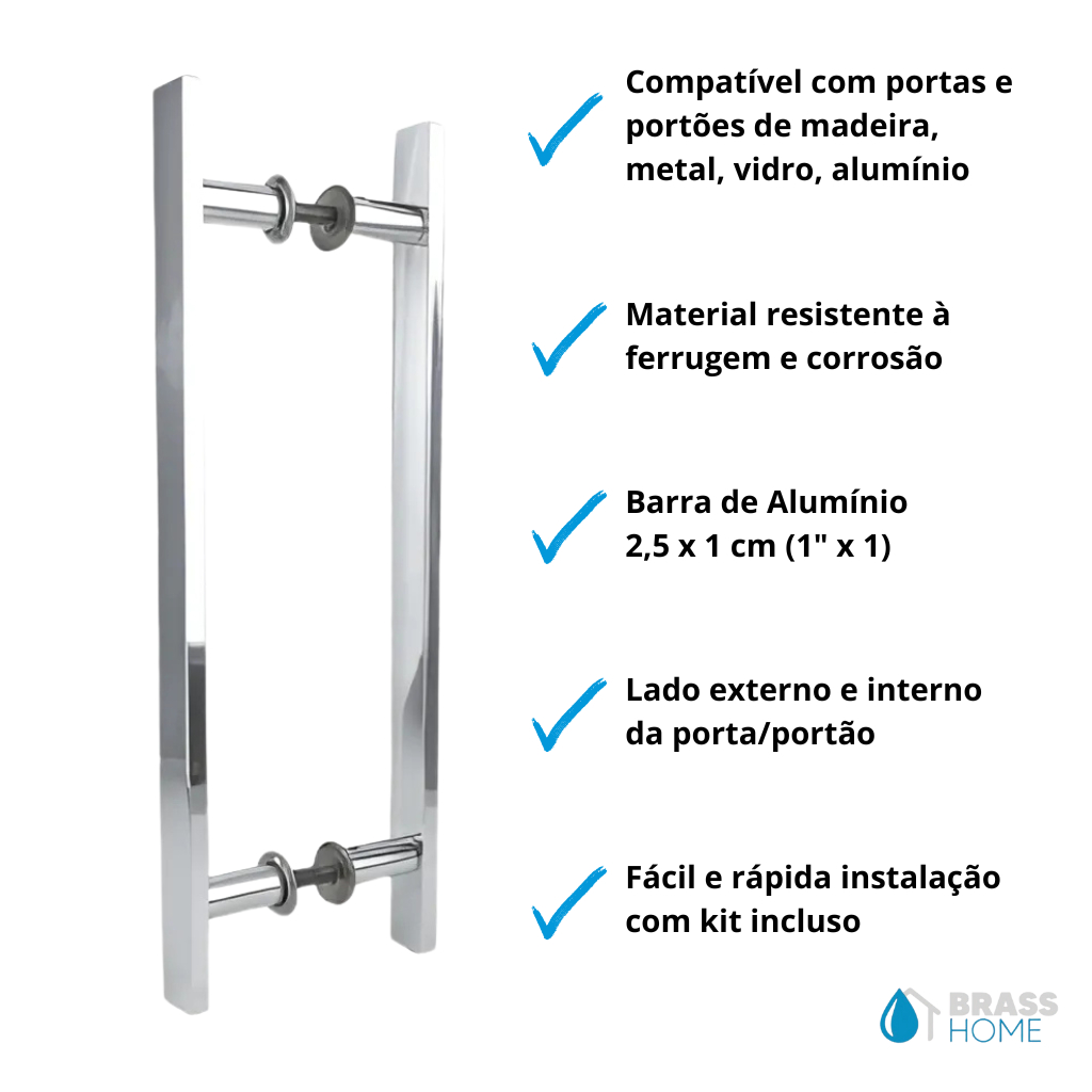 Puxador De Porta 70 cm (60 cm entre furos) Retangular Duplo Portas Pivotante, Correr, Madeira, Vidro Transforme sua porta com elegância! Este puxador retangular é fabricado em alumínio de ALTA QUALIDADE, oferecendo DURABILIDADE e RESISTÊNCIA à corrosão. Ideal para portas e portões de madeira, vidro ou metal, seu acabamento garante um toque contemporâneo e discreto. Perfeito para ambientes modernos, comerciais ou residenciais. ✨ Benefícios do produto: ☑️ Duplo: Ideal para ambientes internos e externos. ☑️ Resistente a corrosão: não enferruja e não descasca. ☑️ Instalação: fácil e rápida. ☑️ Versatilidade: para portas e portões de vidro temperado, madeira, pivotantes, de correr, esquadrias de alumínio, esquadrias de aço, etc. 📏 Características: ➡️ Material: Alumínio polido brilhoso ➡️ Medida do puxador: 70 cm ➡️ Medida entre furos: 60 cm ➡️ Tubo Alumínio: 1"x1 (2,5 cm x 1 cm) 👀 Recomendações: 👉 Utilizar em portas com no máximo 4 cm de espessura. 👉 Faça os furos na porta somente com o produto em mãos. 🔒 COMPRA 100% GARANTIDA 🛡️ GARANTIA: 12 MESES CONTRA DEFEITOS DE FABRICAÇÃO 💎 FABRICAÇÃO NACIONAL COM MATERIAS DE ALTA QUALIDADE 🏭 DIRETO DA FÁBRICA PARA SUA CASA 📦 PRODUTO À PRONTA ENTREGA ✈️ ENVIO IMEDIATO 🛒 BOAS COMPRAS!