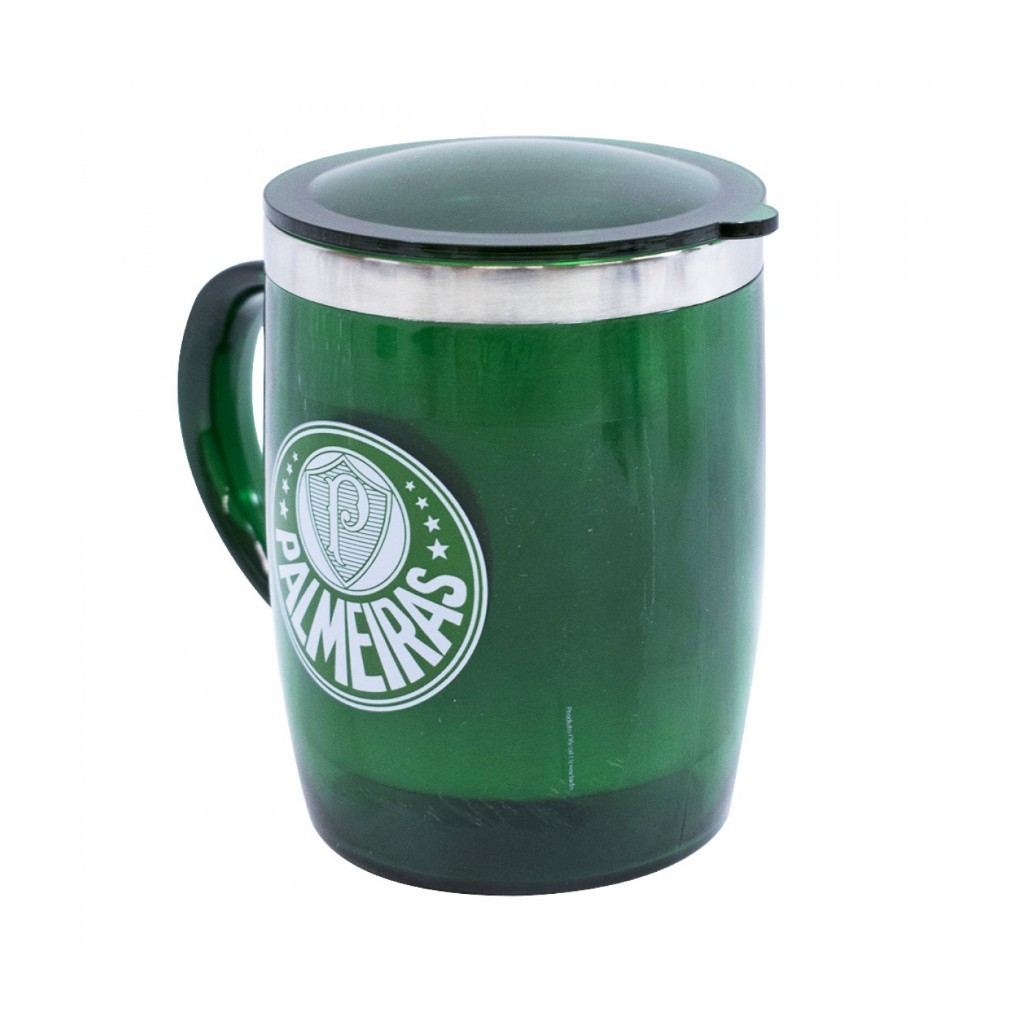Caneca top de venda! Elegante caneca com interior de inox, parte exterior de plástico com brasão do grandioso Palmeiras. Caneca mantém a bebida na temperatura por muito mais tempo. Vem ainda com uma tampa. Material: inox e plástico; Litragem: 450 ml | Sku: QH002AZ-3-B