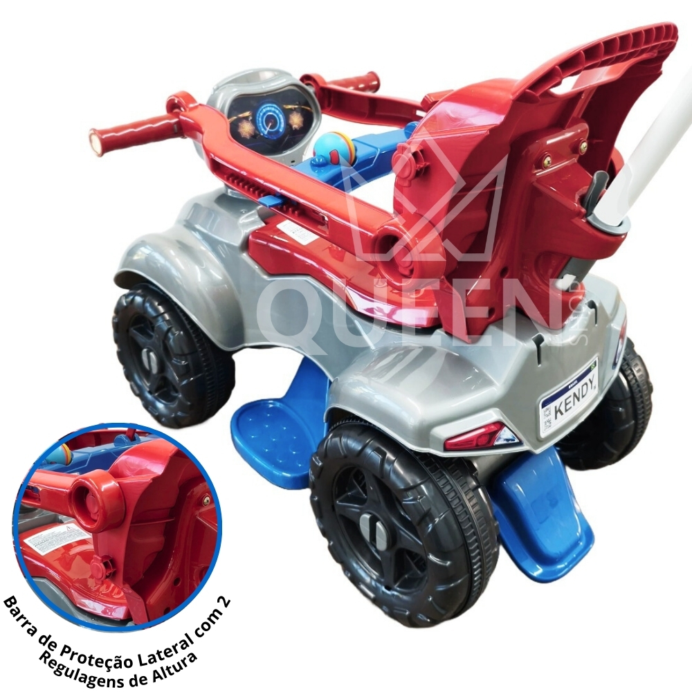 Quadriciclo Passeio Lançamento - Kendy brinquedos Modelo com inovador com funcionalidades e ajustes para o melhor conforto da criança. - Faixa Etária: 1 a 3 anos 👶 - Capacidade de Peso: Até 30kg ⚖️ - Certificação: INMETRO Registro 009183/2024 📜 Características: - Haste de condução em alumínio reforçado (não direcionável) 💪 - Proteção lateral ajustável em 2 alturas 🔒 - Proteção interna ajustável em profundidade 🔩 - Sistema anti-tombamento para maior segurança 🚨 - Chave didática "Crec Crec" para estimular a coordenação motora 🤔 - Chocalho integrado para diversão 🎶 - Encosto ergonômico para maior conforto 😌 - Suporte para bolsas de até 10kg 🛍️ - Compartimento de objetos integrado 📦 - Peso: 4,6kg ⚖️ - Dimensões: 93cm (altura) x 68cm (comprimento) x 41cm (largura) 📏 - Dimensões da Embalagem: 36cm (altura) x 34cm (largura) x 67cm (comprimento) 📦 ATENÇÃO: VERIFIQUE AS DIMENSÕES ALTURA DO CHÃO ATÉ A PONTA DA HASTE: 93cm COMPRIMENTO: 68cm LARGURA: 41cm ALTURA SENTADO DO JOELHO ATÉ O APOIO PARA OS PÉS: 22cm PESO SUPORTADO ATÉ 30KG IDEAL PARA CRIANÇAS ATÉ: 100cm Certificação: INMETRO Registro 009183/2024 📜 Com o Quadriciclo Passeio Spider, seu pequeno aventureiro vai se divertir muito! 😄