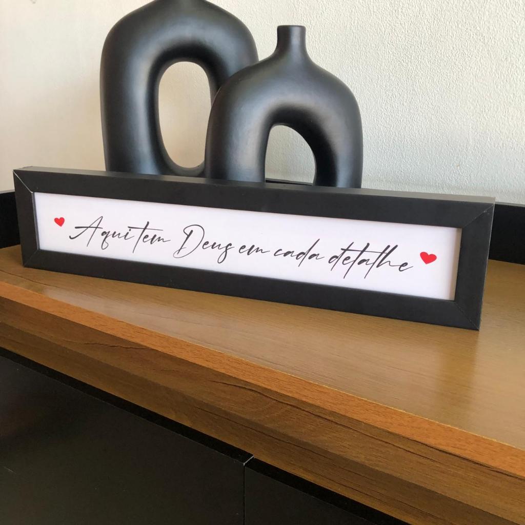 Quadrinho 40X10 AQUI TEM DEUS EM CADA DETALHE coração vermelho para sala/rack/quarto/decoração