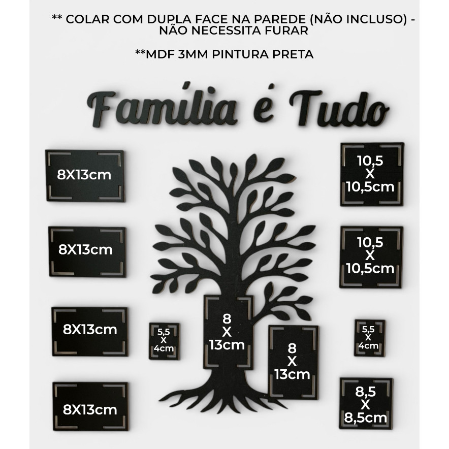 Porta Retrato “Família é Tudo” em MDF – Transforme sua Parede em Emoção e Estilo Transforme qualquer ambiente em um espaço cheio de memórias, afeto e personalidade com o Porta Retrato Família é Tudo em MDF. Com design inspirado em uma árvore genealógica, este painel decorativo foi criado para destacar momentos únicos e contar a história da sua família de forma elegante e marcante. Perfeito para salas de estar, corredores, quartos, escritórios ou qualquer cantinho especial, ele traz aconchego, beleza e um toque sofisticado à decoração. ✨ Design que Encanta Produzido em MDF de alta qualidade, o painel combina resistência, acabamento impecável e um visual moderno. As molduras integradas permitem organizar suas fotos de maneira harmoniosa, resultando em um mural exclusivo que celebra amor, união e boas lembranças. A frase “Família é Tudo” em destaque reforça o significado afetivo da peça e transforma a parede em um verdadeiro ponto de conexão emocional. 📏 Medidas Tamanho do painel montado: Aproximadamente 75 x 53 cm Tamanhos das molduras: MEDIDA 6 BASES 8X13cm, 2 BASES 10,5X10,5cm, 1 base 8,5x8,5cm,2 bases 5,5x4cm 🛠 Características Cor: Preto