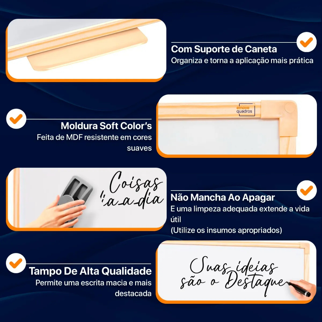 APRESENTE SUAS IDEIAS! Com esta lousa você poderá organizar seus estudos, palestras e até mesmo dar aulas com muita praticidade, agregando benefícios para seu dia a dia! Produzida em materiais de qualidade, a Lousa possuí moldura MDF Soft na cor carvalho e um belo acabamento em pintura UV brilhante em chapa de fibra. Além disso, também conta um um porta caneta e kit fixação invisível para que ele fique impecável em sua parede. ------------------------------------------------------------------- ESPECIFICAÇÕES: Marca: Emove Quadros Modelo: Soft Cor da moldura: Carvalho Cor da lousa: Branco Brilhante UV Largura: 120cm Altura: 90cm CARACTERÍSTICAS: Lousa para uso de marcador de quadro branco Tela em chapa de fibra de madeira Pintura UV de alta durabilidade Kit instalação invisível APLICAÇÃO: Em paredes, tanto na vertical quanto horizontal. Também é possível usá-la em suportes cavaletes específicos para lousas. Consulte-nos para adesão. O QUE VEM INCLUSO? 1 Lousa Emove Quadros 4 Canetas 1 Apagador 1 Porta caneta Acessórios para fixação na parede Este anúncio é de exclusividade da Emove Shop. Qualquer tentativa de cópia será denunciada e resultará em penalizações por meio do Brand Protection Program (BPP). O BPP tem como objetivo proteger nossos direitos relacionados à marca, autoria, modelos e desenhos industriais, patentes e modelos de utilidade.