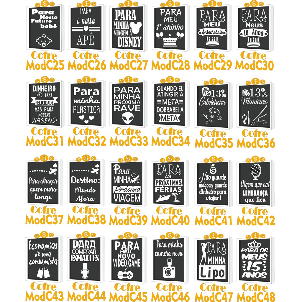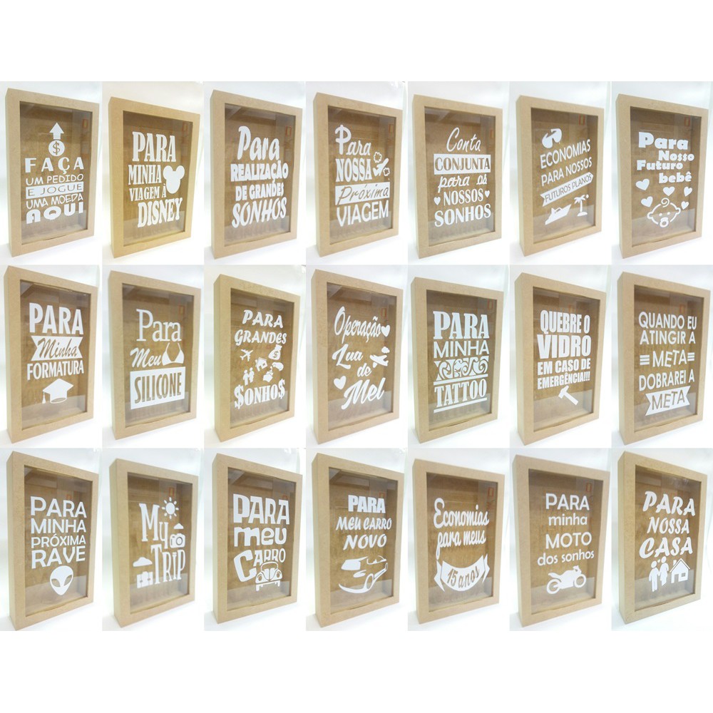 Quadro Cofrinho Porta-Moedas Personalizado – Presente Criativo para Casamento, Viagem ou Decoração ✅ Envio em 24h (após confirmação do pagamento) ✅ Várias frases disponíveis – Escolha a sua favorita ou solicite uma personalizada! ✅ Material resistente: MDF cru + acrílico transparente de 2mm ✅ Prático e funcional: Visor removível (não precisa quebrar) e fundo fixo ✅ Medidas: 27cm (altura) x 17cm (largura) x 4cm (profundidade) ✨ Perfeito para: Presentes criativos Lembrancinhas de casamento Economizar moedas para viagens Decoração temática 💵 PREÇOS IMBATÍVEIS PARA REVENDEDORES! 📌 Obs: Suporte para pendurar não incluso. TODAS FRASES DISPONÍVEIS (CONSULTE AS FOTOS DO ANÚNCIO): SELECIONE JÁ O SEU! 🚀