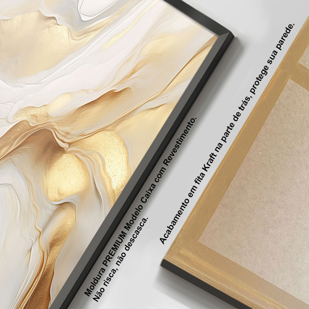 Quadro com Moldura e Acrilico Cristal Vidro Sala Quarto Abstrato Dourado Branco Mármore Decorativo Horizontal