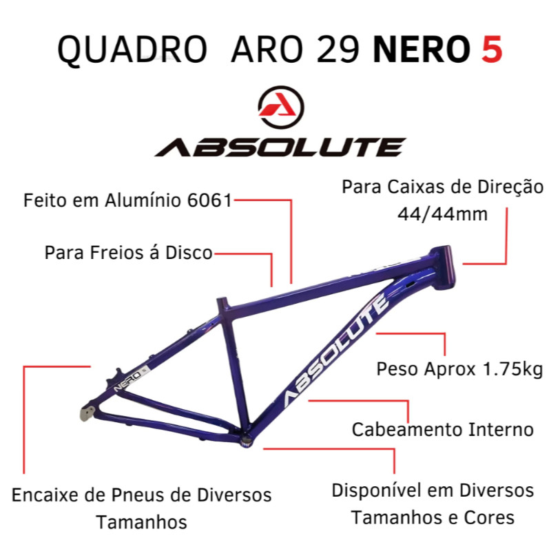 Quadro Absolute Nero 5: Desempenho e Estilo para Ciclistas Apaixonados Descubra o Quadro Absolute Nero 5, a escolha perfeita para ciclistas que não abrem mão de performance, resistência e um design impactante. Projetado especialmente para os amantes de MTB, este modelo revolucionário traz aprimoramentos que elevam sua experiência sobre duas rodas. Características Incríveis - Modelo Moderno: Absolute Nero 5, o mais recente da linha. - Material Premium: Feito em alumínio 6061 de alta qualidade, leve e resistente. - Tamanho Perfeito: Compatível com rodas aro 29, pronto para qualquer aventura. - Cabeamento Interno: Protege os cabos e proporciona um visual clean e elegante. - Geometria Aprimorada: Maior estabilidade e controle, seja em trilhas desafiadoras ou em estradas urbanas. Especificações Técnicas - Compatibilidade: - Caixa de Direção: 44/44 mm - Suspensão/Garfo: Espiga reta 1-1/8" - Movimento Central: Rosca Inglesa BSA - Câmbio Dianteiro: Puxada por baixo (31,8 mm) - Suporte de Freio: A disco padrão IS - Canote: 27,2 mm com abraçadeira de 31,8 mm - Design Sofisticado: Cores vibrantes e acabamento de alta qualidade, para se destacar em qualquer ambiente. - Tamanhos Variados: Opções disponíveis para todos os tipos de ciclistas, 13.8/15/17/21. Benefícios que Fazem a Diferença - Durabilidade Excepcional: Construído para resistir ao tempo e a impactos. - Desempenho Superior: Geometria otimizada que maximiza a agilidade nas trilhas. - Conforto para Longas Distâncias: Design ergonômico que garante conforto em cada pedalada. - Estética Atraente: Visual moderno, com cabeamento interno que impressiona. Transforme suas pedaladas com o Quadro Absolute Nero 5! Seja em trilhas emocionantes ou passeios pela cidade, este quadro é a garantia de qualidade e desempenho que você merece. Não perca a chance de elevar sua experiência ciclística—adquira o seu agora e sinta a diferença!
