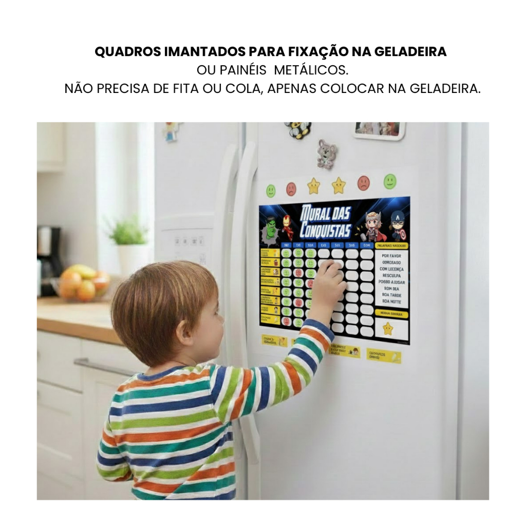 Uma maneira educativa divertida, eficaz e intuitiva de melhorar comportamentos desafiadores em crianças é utilizar uma ferramenta que ajude a organizar a rotina delas. O quadro de incentivo e rotina, recomendado por psicólogos e psicopedagogos, é uma excelente opção para isso. Esse Kit é composto: 1 Quadro Minha Rotina Diária Acompanha cartela de marcadores: 60 Carinhas Felizes 40 Carinhas Tristes 30 Tarefas 10 Tarefas Personalizáveis 10 Estrelas Você recebe todas as tags destacadas, recortadas e prontas para uso, facilitando e otimizando seu tempo. DESCRIÇÃO: Tamanho: 30cm largura x 22cm de altura. Verso totalmente imantado e frente em adesivo vinil impressão digital. OBS.: Não recomendamos a fixação em Geladeiras Plotadas, Inox ou em qualquer outra superfície que possa comprometer a fixação. O quadro acompanha 30 regras em manta magnética, permitindo que você personalize seu quadro conforme desejar. Isso facilita a substituição das regras sem causar danos ao material. 30 regras que acompanham o quadro: Comer frutas Pentear o cabelo Se vestir sozinho Fazer xixi e cocô no vaso Não chupar chupeta e dedo Respeitar o(a) irmãozinho(a) Arrumar a cama ao acordar Dividir os brinquedos Tomar banho Lavar as mãos Não gritas e não fazer birras Dormir e acordar no horário certo Não falar palavrões Roupas suja no cesto Ir para a escola Hora da comida Ajudar nas tarefas de casa Cuidar dos brinquedos e dos pertences Obedecer papai e mamãe Não bater, nem brigar Escovar os dentes Fazer as lições e deveres de casa Fazer as orações Ser amável e educado Falar palavras mágicas Beber água Dormir na própria cama Respeitar hora de tv e celular Comer verduras e legumes Prêmio MATERIAL: Manta Magnética . FIXAÇÃO: Fixação em geladeira, ou superfícies como painéis metálicos, armários, entre outros. Atenção: Os marcadores não irão se fixar caso o quadro seja colocado na parede.