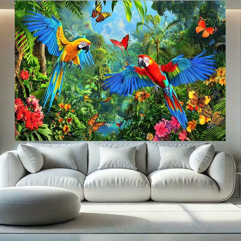 Quadro Decorativo 1 Araras Coloridas na Floresta Tropical Borboletas Flores Natureza Sala Quarto
