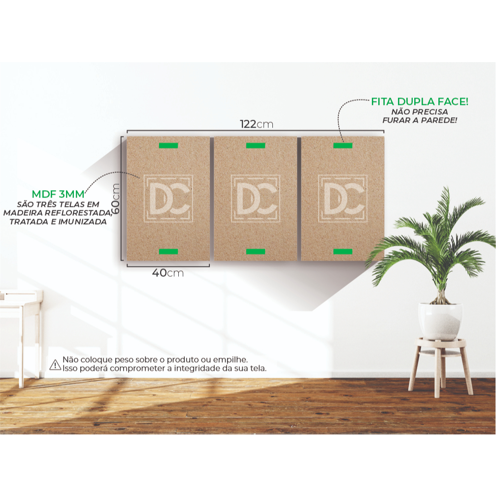 Transforme o ambiente da sua casa, quarto ou escritório com elegância e sustentabilidade usando nossos quadros decorativos. Este conjunto é composto por 3 peças 40x60 cm cada, cuidadosamente confeccionadas para oferecer qualidade e estilo. IMPORTANTE: Especificar, por gentileza, na observação do pedido ou via chat, o nome desejado após realizar a compra. Características • Tamanho: Cada peça mede 40x60 cm, ideal para criar um impacto visual significativo no ambiente. • Material: Feitos de MDF de madeira reflorestada, garantem um produto ecológico e sustentável. • Revestimento: Cobertos com adesivo vinil de qualidade fotográfica, proporcionando imagens nítidas e cores vibrantes. • Facilidade de Instalação: Acompanha fita dupla face, evitando a necessidade de furar a parede. Perguntas Frequentes • Como faço para instalar os quadros? 1. Nossos quadros vêm com fita dupla face de alta qualidade, permitindo uma instalação rápida e fácil sem a necessidade de furar a parede. • Os quadros danificam a parede ao serem removidos? 1. Não, a fita dupla face incluída permite que você remova e reposicione os quadros sem danificar a parede. Informações de Envio • Prazo de Entrega: Enviamos seu pedido em 1 dia útil. • Embalagem Segura: Nossos quadros são cuidadosamente embalados para garantir que cheguem sem danos até a sua casa. Suporte ao Cliente e Personalização • Tire suas dúvidas: Estamos disponíveis pelo chat para responder qualquer pergunta ou fornecer assistência. • Quadros Personalizados: Oferecemos a opção de criar quadros personalizados conforme suas preferências e necessidades, nos contate pelo chat. Invista em arte e estilo com nossos quadros decorativos e transforme qualquer ambiente de maneira prática e elegante.