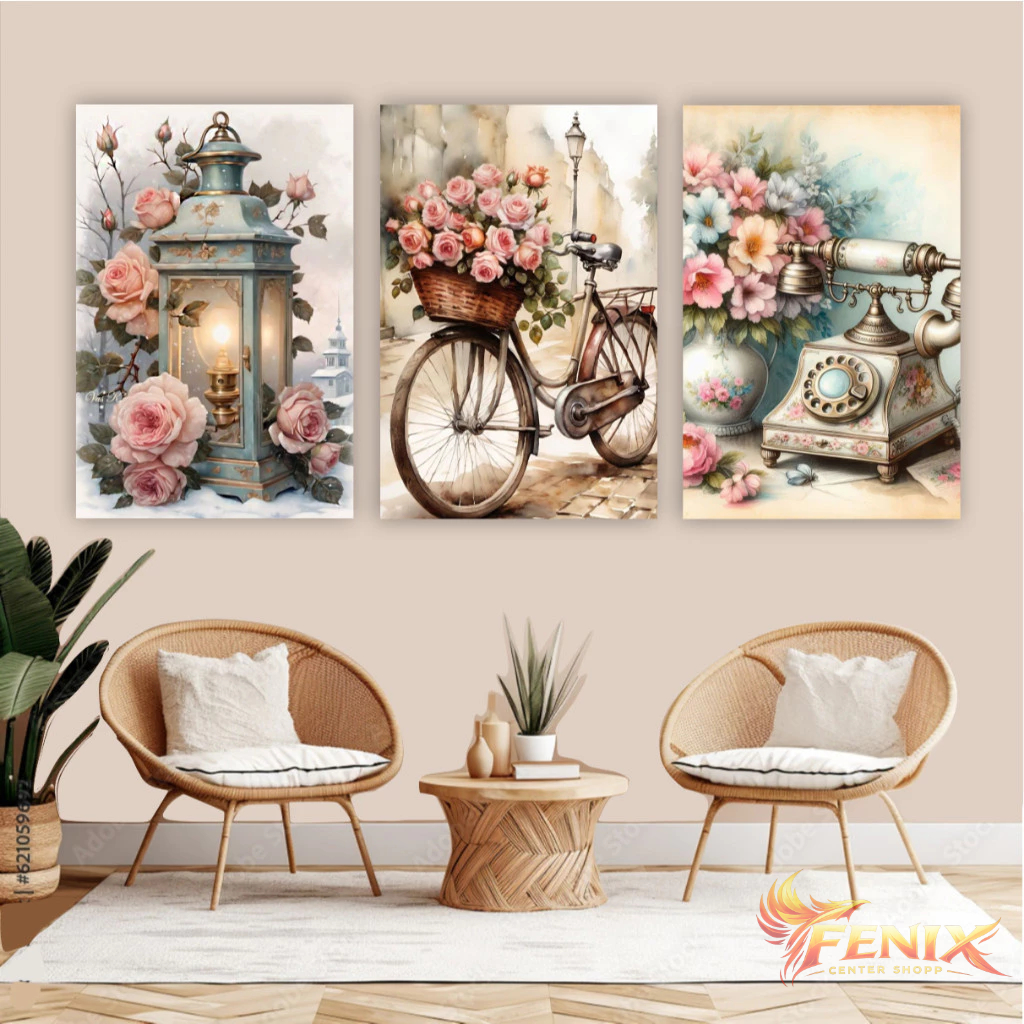 Quadro decorativo 3 peças bicicleta flores vintage decoração antiga para sala quarto varanda fazenda