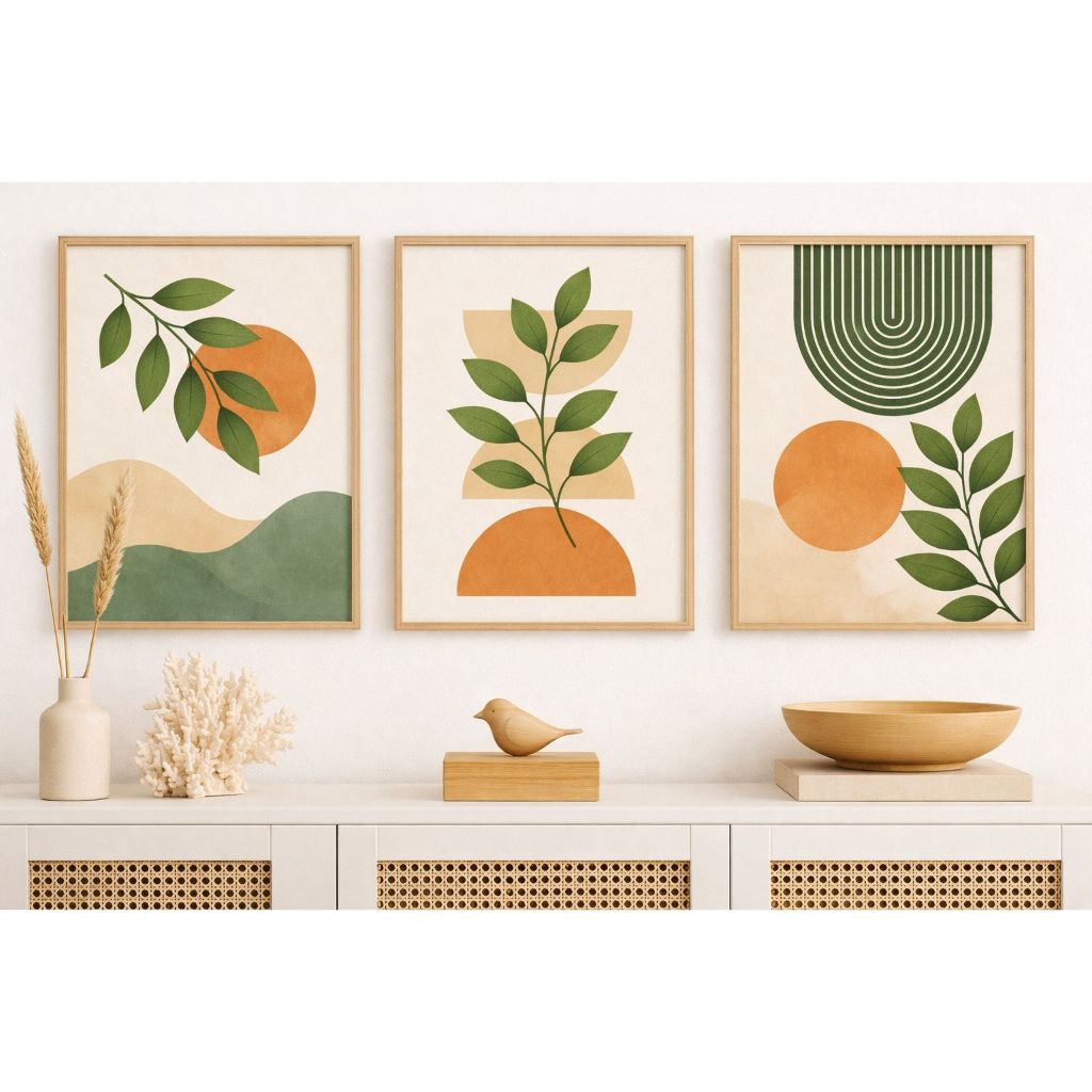 Quadro Decorativo 3 Peças Boho Moderno Abstrato Verde Nude Bege Folhas Decoração Casa