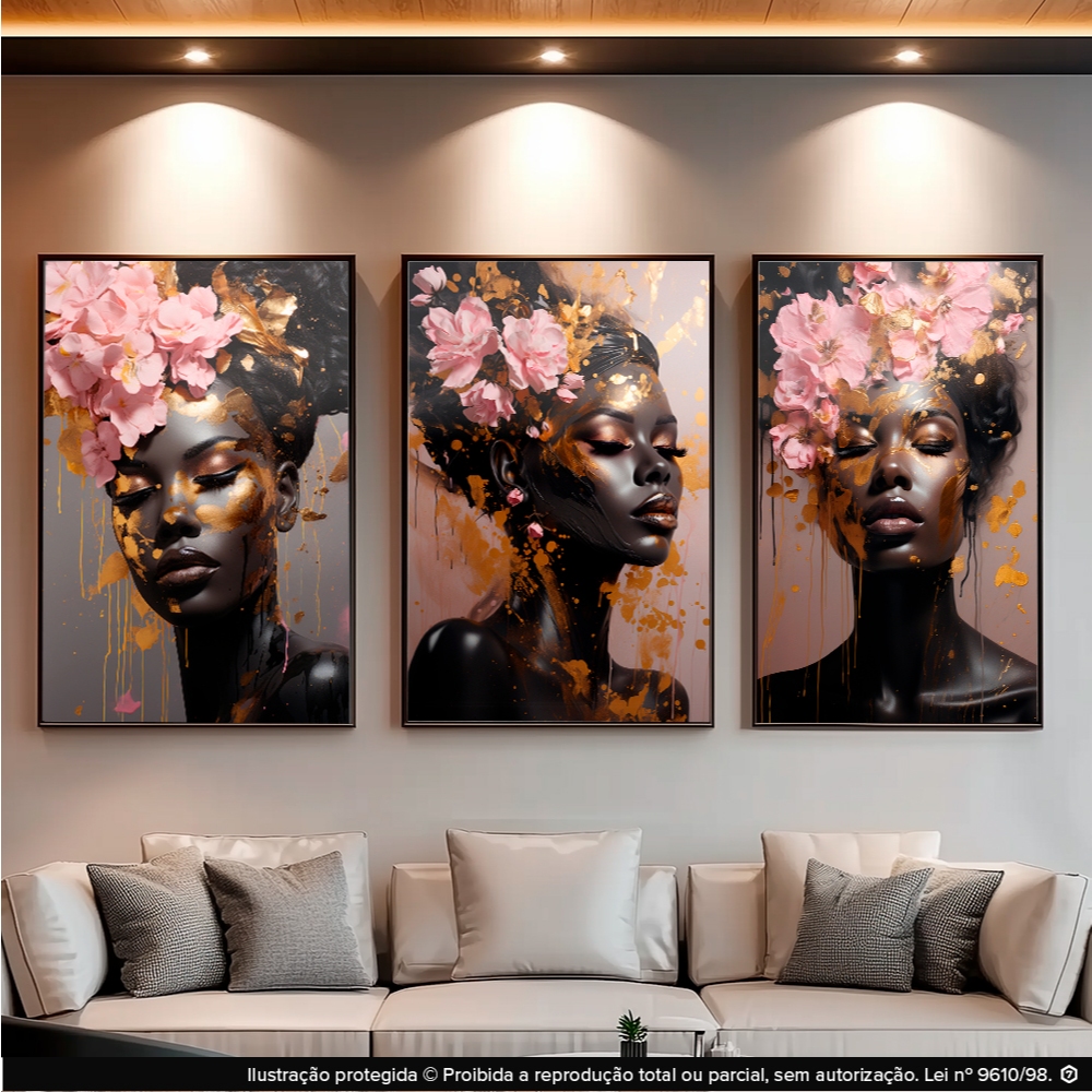 Quadro Decorativo 3 Peças Feminino Mulheres Negra Rose Dourado Luxo para Salão de Beleza Estética Quarto