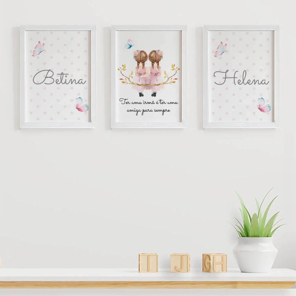 Quadro decorativo 3 peças Irmãs personalizado com nome decoraçao quartinho