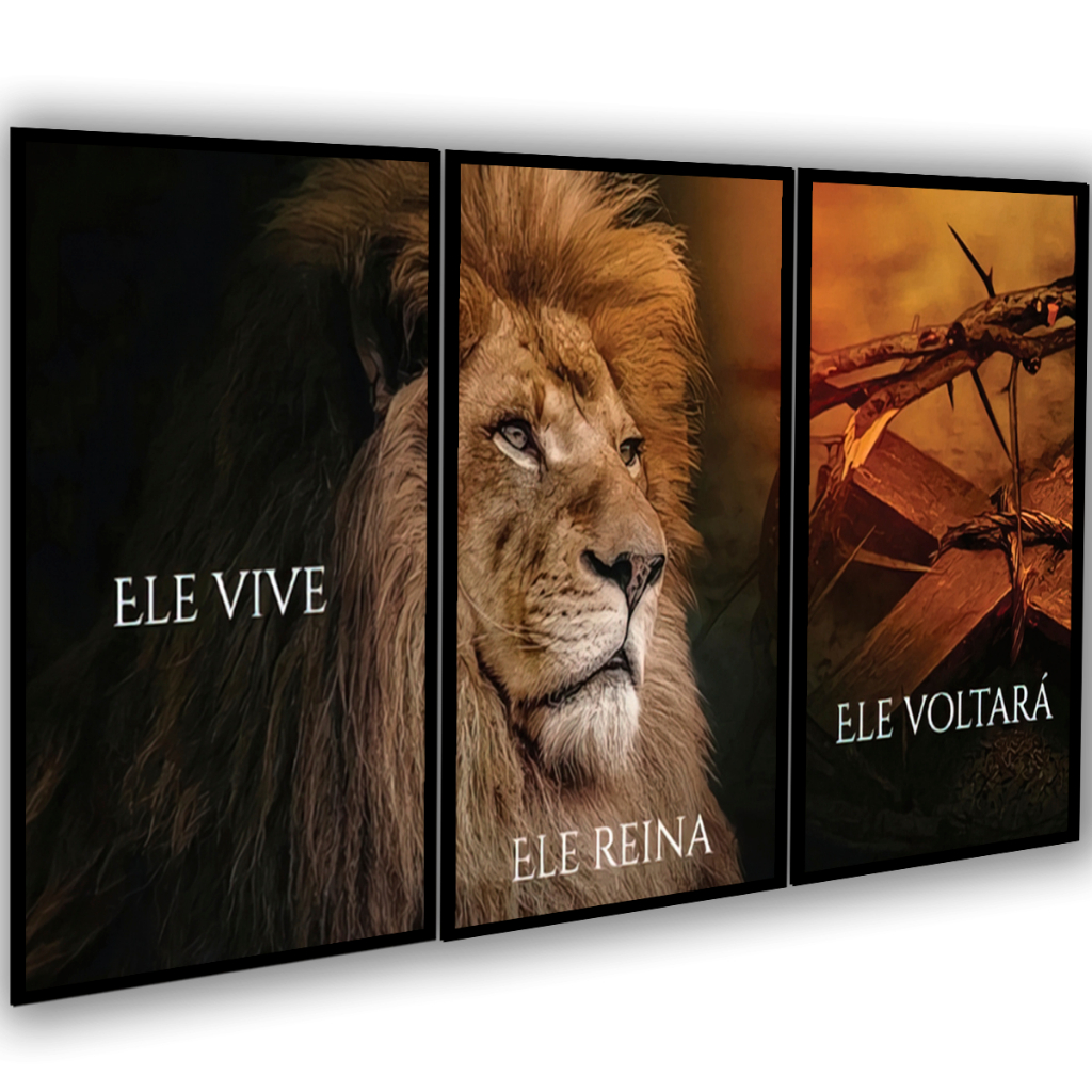 Quadro Decorativo 3 Peças Mosaico Jesus de Juda Ele Voltará Ele Vive Reina Para Sala Quarto Moldura