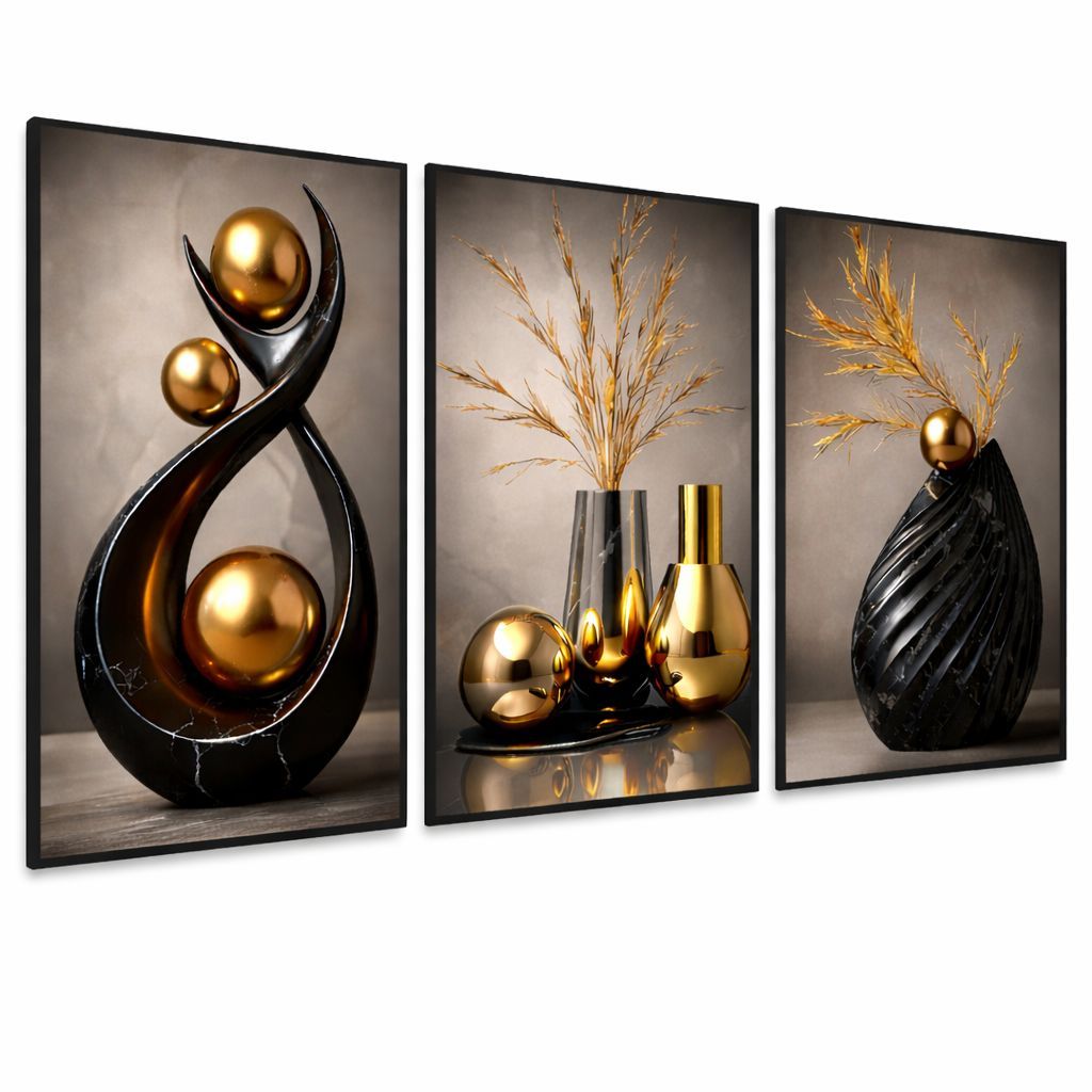 Quadro Decorativo 3 Peças Trio Abstrato Geométrico Moderno Escultura Dourada Luxo Sala