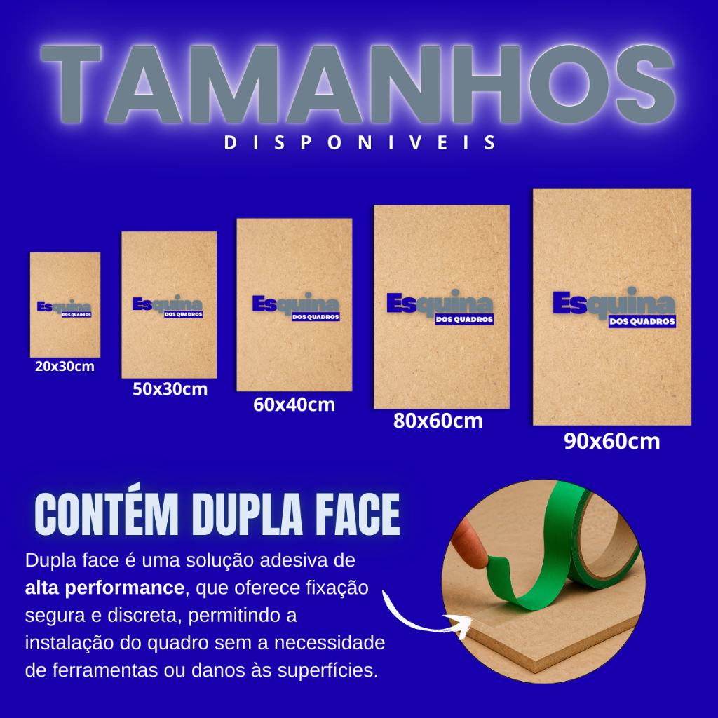DECORAGORA – Quadros Decorativos & Decorações Quadro Decorativo em MDF com Vinil | Pronto para Instalação Renove seus ambientes com sofisticação e praticidade. O Quadro Decorativo DECORAGORA é produzido em MDF de alta qualidade e revestido com vinil de excelente acabamento, proporcionando durabilidade, beleza e um visual moderno para qualquer espaço. Diferenciais do Produto • Material Premium: MDF resistente com revestimento em vinil de alta definição. • Pronto para Instalação: Acompanha fita dupla face de alta aderência, dispensando o uso de ferramentas ou perfurações na parede. • Design Exclusivo: Peça única, ideal para compor uma decoração moderna e personalizada. • Acabamento Impecável: Superfície lisa, cores vivas e excelente definição de imagem. • Embalagem Segura: Enviado em embalagem de papelão reforçado, garantindo proteção durante o transporte. Dimensões Disponíveis • 20 cm (L) x 30 cm (A) • 50 cm (L) x 30 cm (A) • 60 cm (L) x 40 cm (A) • 70 cm (L) x 50 cm (A) • 90 cm (L) x 70 cm (A) • 120 cm (L) x 80 cm (A) – Ideal para ambientes mais amplos Informações Importantes • Produto composto por 1 peça única • Não acompanha moldura • Não acompanha iluminação LED Cuidados e Conservação • Limpeza apenas com pano macio levemente umedecido em água • Não utilizar produtos químicos ou abrasivos • Evitar exposição direta e prolongada ao sol • Não instalar em paredes texturizadas ou com umidade excessiva Seguindo estas recomendações, seu quadro manterá a qualidade, cores e acabamento por muito mais tempo.