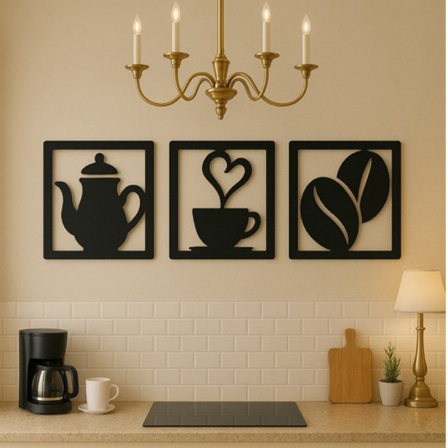 Transforme sua cozinha em um ambiente moderno e aconchegante com este conjunto de quadros decorativos de café em MDF preto! Com design minimalista e corte a laser de alta precisão, as três peças representam elementos do café (bule, xícara e grãos), trazendo sofisticação e charme para sua decoração. Perfeito para cozinhas, salas de jantar, cafeterias ou cantinhos do café, este conjunto se destaca pelo acabamento elegante e pelo contraste marcante do preto sobre paredes claras ou texturizadas. ✨ Características do produto: • Material: MDF de alta qualidade • Cor: Preto fosco • Conjunto com 3 peças • Corte a laser com acabamento fino • Instalação fácil (adesivo dupla face ou ganchos, conforme o modelo) • Leve e resistente • Produzido com tecnologia de precisão 🏡 Ideal para decorar: Cozinhas • Salas de jantar • Cantinhos do café • Restaurantes • Cafeterias