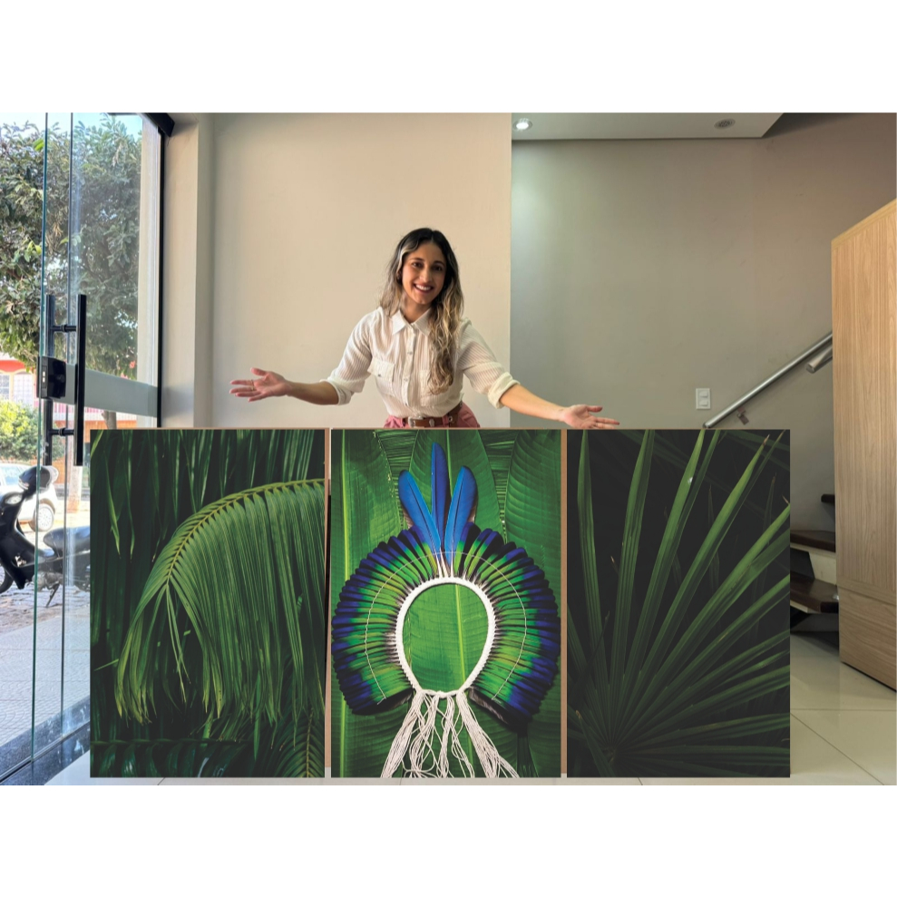 QUADRO DECORATIVO COCAR INDIGINA VERDE FOLHAGEM 3 TELAS