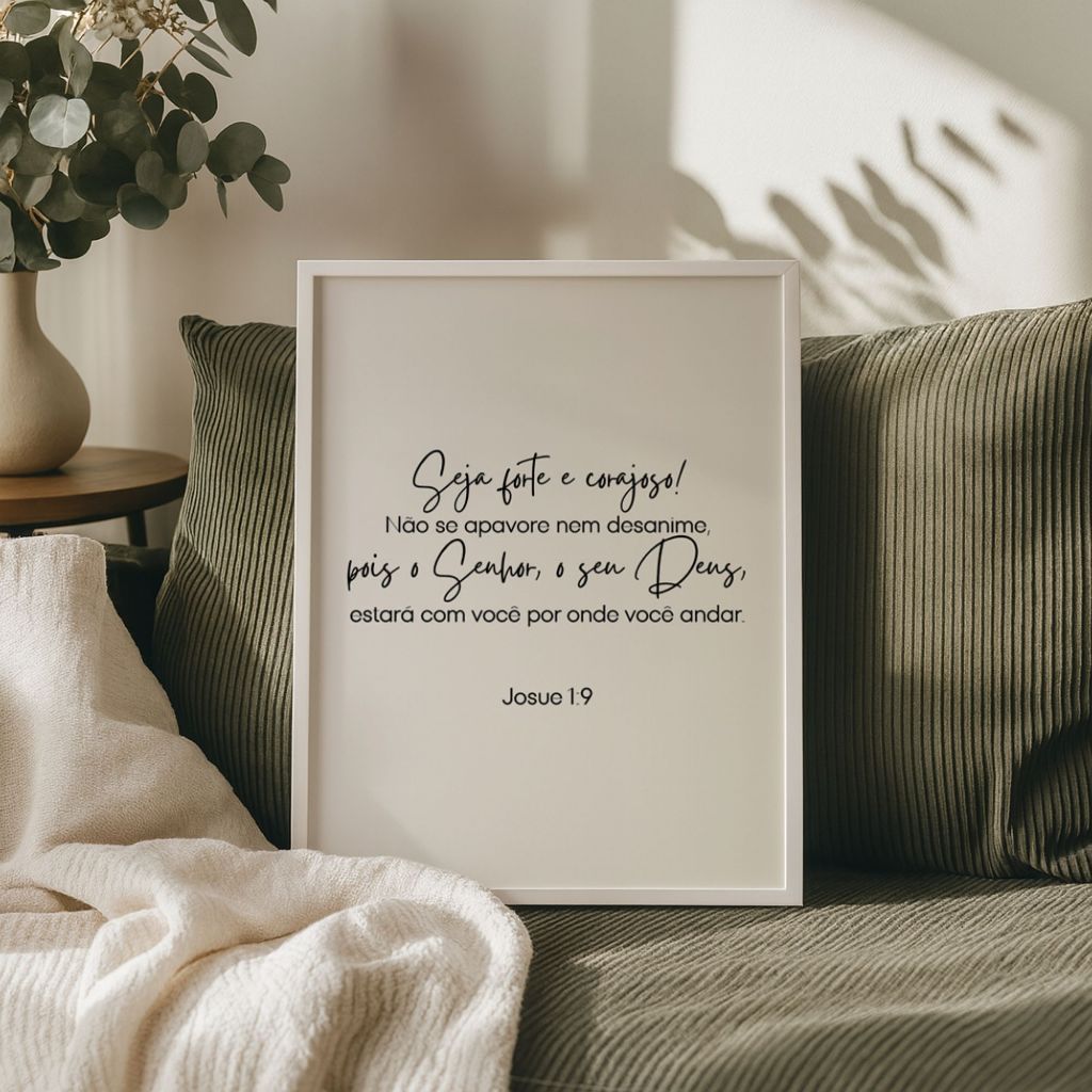 Transforme sua casa com fé, beleza e propósito. Este quadro com o versículo Josué 1:9 é mais do que uma peça de decoração — é um lembrete diário de força e coragem. Com um design clean e elegante, ele combina com qualquer ambiente, levando uma mensagem de fé que toca o coração. ✨ Detalhes que fazem a diferença: . Fabricação Própria . Impressão em alta resolução, sem reflexos. Material anti chamas e anti Mofo. . Moldura em madeira pinus 100% natural e laqueada . Fundo em madeira Eucatex . Material ecológico com selo FSC . Disponível em 3 tamanhos: A4 (32x23), A3 (42x30) e A2 (60x40) . Molduras disponíveis nas cores: preta, branca ou carvalho . Não precisa de vidro — a impressão é resistente, não amarela e não desbota. . Envio rápido no mesmo dia (para compras até meio-dia em dias úteis) - Produto a pronta entrega. 💡 Ideal para decorar: sala, quarto, escritório, cantinho da oração ou presentear alguém especial. ✅ Alta durabilidade | Acabamento impecável | Estilo atemporal 📣 Leve agora mais inspiração e significado para sua casa! Clique em comprar agora e receba seu quadro com envio rápido, qualidade garantida e aquele toque de fé que transforma qualquer ambiente 💛 ❓ DÚVIDAS FREQUENTES 1. Os quadros são bem embalados? Sim. Os nossos quadros são enviados em embalagens próprias, revestidos com plástico bolha. 2. A moldura é realmente de madeira? Sim! A moldura é de madeira de qualidade, deixando os quadros elegantes e prontos para completar a decoração do seu ambiente. 3. Os quadros têm vidro? Por padrão, nossos quadros não são enviados com vidro. A impressão de alta qualidade dispensa o uso do vidro pelo seu destaque natural. 4. O pedido chega em quanto tempo? Fazemos os envios no mesmo dia (em dias úteis) para compras aprovadas até o meio-dia. Modalidade Flex: entrega no mesmo dia Modalidade Full: entrega em até 24h em capitais Modalidade padrão: varia conforme o CEP 5. Como posso pendurar na parede? Nossos quadros acompanham um pendurador "jacaré" já instalado na moldura que é pendurado na parede por um prego. 6. Posso pendurar com fita dupla face? Sim. Desde que a fita seja de boa qualidade, os quadros podem ser pendurados facilmente. São leves e práticos. 7. Ainda tenho dúvidas, como posso resolver? Sinta-se à vontade para entrar em contato conosco pelo campo de Perguntas. Estamos à disposição para te atender com carinho!