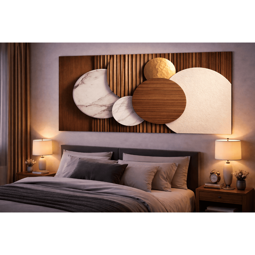 Quadro Decorativo Design Circular Abstrato em Bege Castanho Branco e Dourado Luxo Minimalista