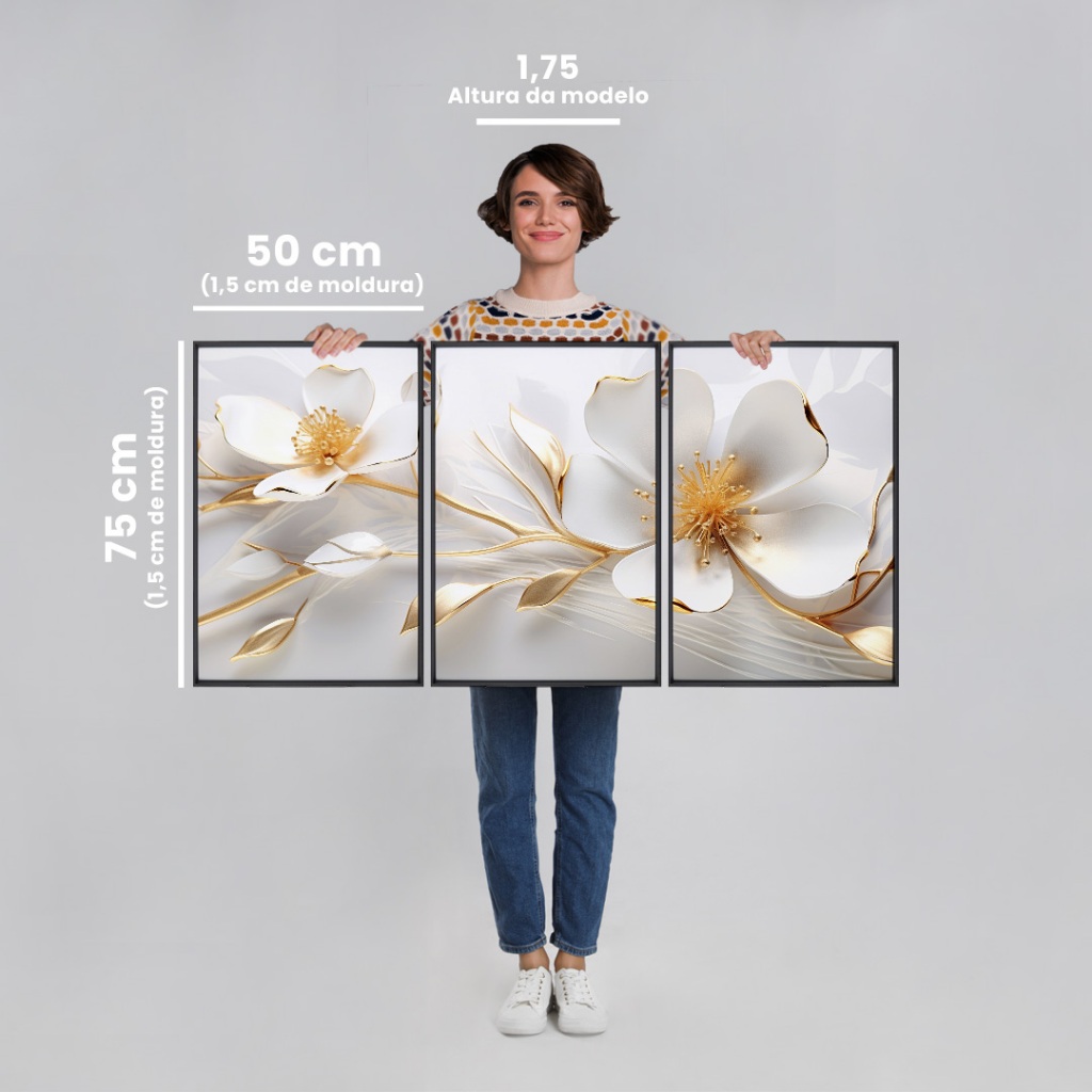 Quadro Decorativo Elegância em Flor Em 3 Telas Moldura Branca 50x75