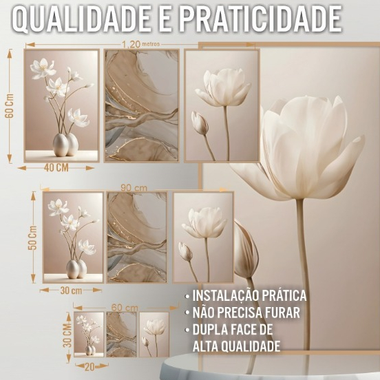 Kit contendo 3 Peças - Flores Gold (COM ESPAÇAMENTO ENTRE AS PEÇAS DE 2cm) - 3 Tela (Altura x Largura): 50x30cm - 3 Tela (Altura x Largura): 20x30cm - 3 Tela (Altura x Largura):60x40cm Informações Técnicas: - O quadro não precisa de moldura, pronto para pendurar na parede. - São feitos em adesivos de alta qualidade em impressão. – Não é necessário furar a parede para instalação, pois, enviamos fitas com grande poder adesivo para melhor instalação. - É necessário na hora da instalação posicionar o quadro em 02 cm de largura entre eles para melhor qualidade de visualização. - Dimensão Real de Cada Quadro. OBS: (SELECIONAR NA VARIAÇÃO O TAMANHO DA PLACA) CUIDADOS: - Limpeza: Utilizar Pano Seco ou espanador. - Utilizar em ambientes internos. - Não exponha o produto em paredes com sinais de umidade ou sob luz direta do sol, pois estes são prejudiciais a longevidade do mesmo. - Não coloque peso sobre o produto ou empilhe, isto poderá deformar sua tela. Dúvidas Frequentes: - Reclamação ou Defeito? Caso o produto chegue com algum defeito ou você tenha alguma reclamação a fazer, pedimos que nos envie uma mensagem relatando o problema com o produto, nos informes no campo de mensagens primeiro, pois, a reclamação aberta pode demorar mais de 10 dias úteis para ser finalizada. No campo da mensagem iremos resolver o mais breve possível, para melhor atender sua solicitação. - Garantia? Oferecemos 90 dias para defeitos de fabricação. - Tem a pronta entrega? Sim, todos os nossos produtos estão à pronta entrega. - Vem pronto para pendurar? Sim, vai com uma fita dupla face que basta retirar o lacre e colar no local desejado, a fita é de alta qualidade e tem que ter cuidados ao manuseá-la. - Demais dúvidas estamos à disposição, basta nos chamar no campo mensagens que estamos aqui para melhor atendê-los