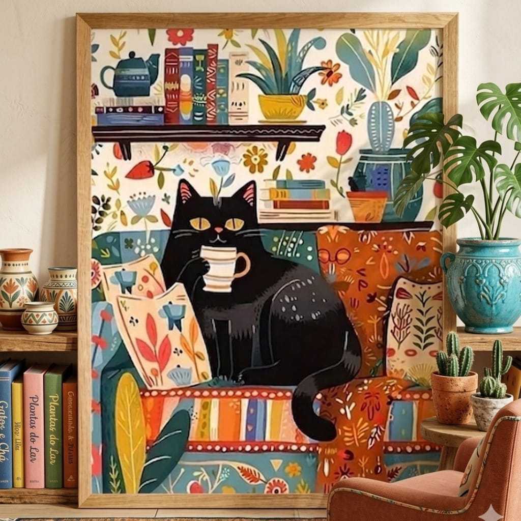 Transforme seu ambiente com este lindo quadro decorativo de gato preto em estilo artístico moderno e colorido. Ideal para quem ama gatos e quer trazer personalidade, aconchego e charme para a decoração da sala, quarto, escritório ou consultório. A ilustração apresenta um gato preto elegante em uma poltrona estampada, com fundo floral vibrante e detalhes em livros e plantas, criando um visual sofisticado, criativo e acolhedor. 🖌️ Estilo: Arte moderna, ilustrativo, boho, escandinavo 🏠 Ideal para: Sala, quarto, escritório, hall de entrada, consultório, decoração geek ou criativa 📏 Tamanhos disponíveis (1 peça): • 40x60 cm • 90x70 cm • 110x80 cm 🎁 Ótima opção para presente criativo para amantes de gatos e decoração. quadro decorativo gato, quadro gato preto, quadro moderno sala, quadro grande decorativo, arte colorida parede, quadro para sala moderno, quadro para quarto, decoração com gato, quadro vertical grande, quadro artístico moderno, quadro 40x60, quadro 90x70, quadro 110x80, decoração boho, quadro criativo