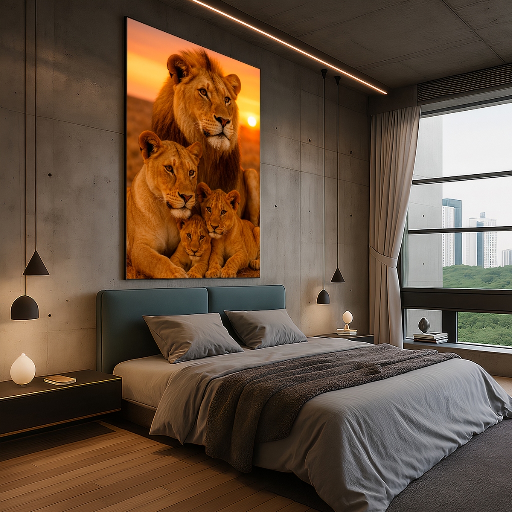 Quadro Decorativo GRANDE Alta Resolução Escritório Quadro Familia de Leão Por do Sol 2 Filhotes