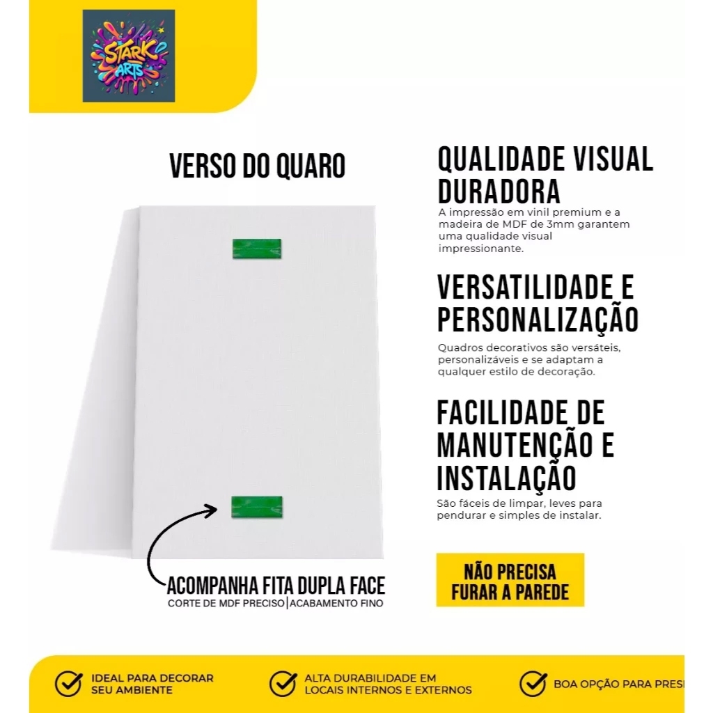 Material: MDF duratex, 3mm, ótima qualidade ! Adesivo vinil de alta qualidade Especificações - Moldura : Sem moldura - Medida dos quadros : 1 Peça 13x19 - Profundidade de 3 mm (Espessura da placa MDF) - Não Acompanha Vidro Instalação A instalação é muito simples, os quadros já vem com uma fita dupla face para que você possa o instalar em qualquer superfície desejada. Limpeza Utilize um pano úmido com apenas água para garantir maior durabilidade do produto. Impressão e acabamento Nossos quadros são impressos em Vinil Semi Brilho de alta qualidade, utilizamos MDF com espessura de 3mm, para que tenha um produto de alta qualidade e resistente. Não precisa de moldura, pois o acabamento das bordas é feito com a própria imagem, para uma visão super realista e com boa profundidade do produto. Embalagem Embalagem feita com liner, plástico bolha e caixa de papelão para que receba seu produto em perfeito estado. Envio Caso adquira o produto antes das 15:00 horas enviamos o pedido para você no mesmo dia, com exceções de feriados e finais de semana!