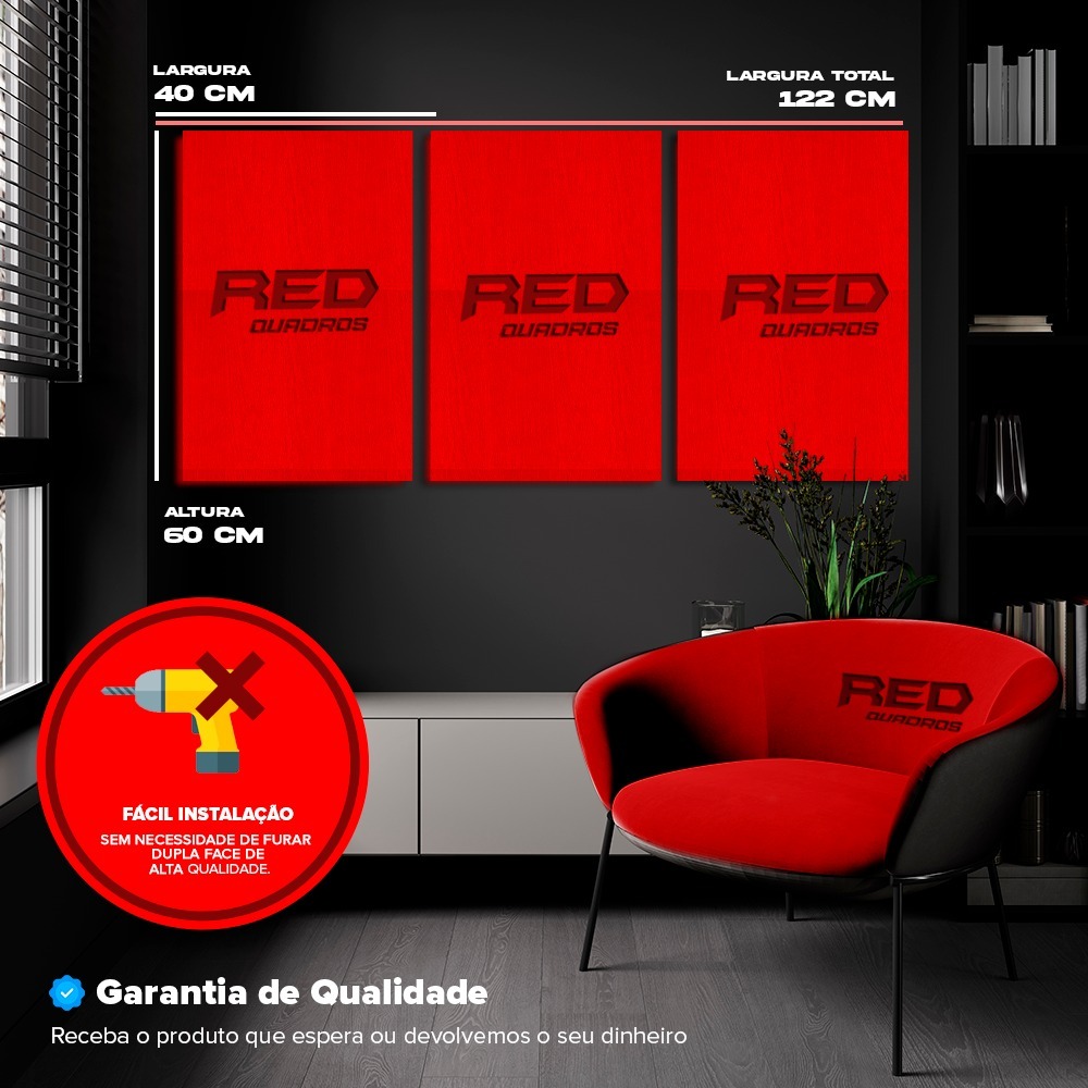 RED QUADROS ´´´´Tela em Chassi De Madeira MDF (reflorestada, tratada e imunizada) Informações Técnicas: - O Quadro De Parede pronto para pendurar na parede. - São feitos em adesivos ‘’vinil’' de alta qualidade em impressão. - Não é necessário furar a parede para instalação, pois, enviamos fitas com grande poder adesivo para melhor instalação. - É necessário na hora da instalação posicionar o Quadro De Parede em 01 cm de largura entre eles para melhor qualidade de visualização. Trabalhamos com as seguintes medidas.. 3 PEÇAS 20X30 TOTAL 63X30 3 PEÇAS 30X50 TOTAL 93X50 3 PEÇAS 40X60 TOTAL 123X60 Cuidados: - Limpeza: Utilizar Pano Seco ou espanador. - Utilizar em ambientes internos. - Não exponha o produto em Parede com sinais de umidade ou sob luz direta do sol, pois estes são prejudiciais a longevidade do mesmo. - Não coloque peso sobre o produto ou empilhe, isto poderá deformar sua tela. QUALQUER DÚVIDA SOBRE O PRODUTO CONTATE NOSSA EQUIPE, IREMOS ATENDE-LOS DA MELHOR MANEIRA POSSIVEL E TIRAREMOS TODAS SUAS DUVIDAS !! Garantia do vendedor: 3 meses